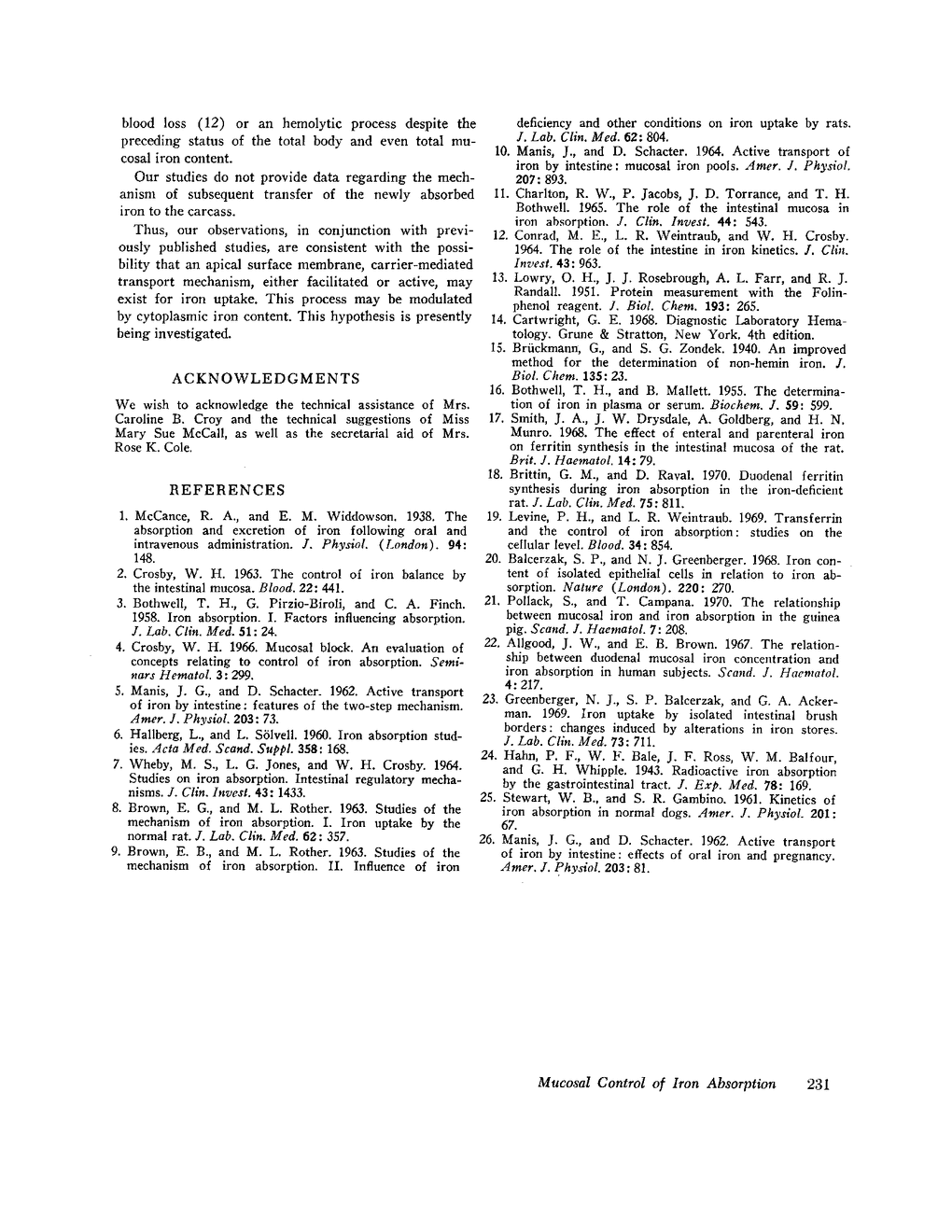 Gastrointestinal mucosal factors controlling rates of iron absorption were studied utilizing an in vivo closed duodenal loop technique. Cellular distribution of newly absorbed radioiron was identified by molecular sieve and iron-exchange chromatography of the mucosal cell supernate. In the normal animal, iron rapidly appeared in ferritin, and this fraction accounted for greater than 90% of mucosal supernatant radioactivity after 60 min absorption time. The nonferritin radioiron appeared to be unbound iron salts. In the presence of increased iron absorption induced by iron depletion or hemolysis, the major difference from the normal distribution pattern was an increase in the proportion and quantity of the free iron salts. Incorporation of newly absorbed iron into ferritin did not correlate with the rate of iron absorption. No evidence was found for a specific soluble iron-chelating molecule within the mucosal cell. The nonheme iron content of the mucosal supernates from iron-deficient and hemolyzing animals were significantly lower than in the normal animal.
