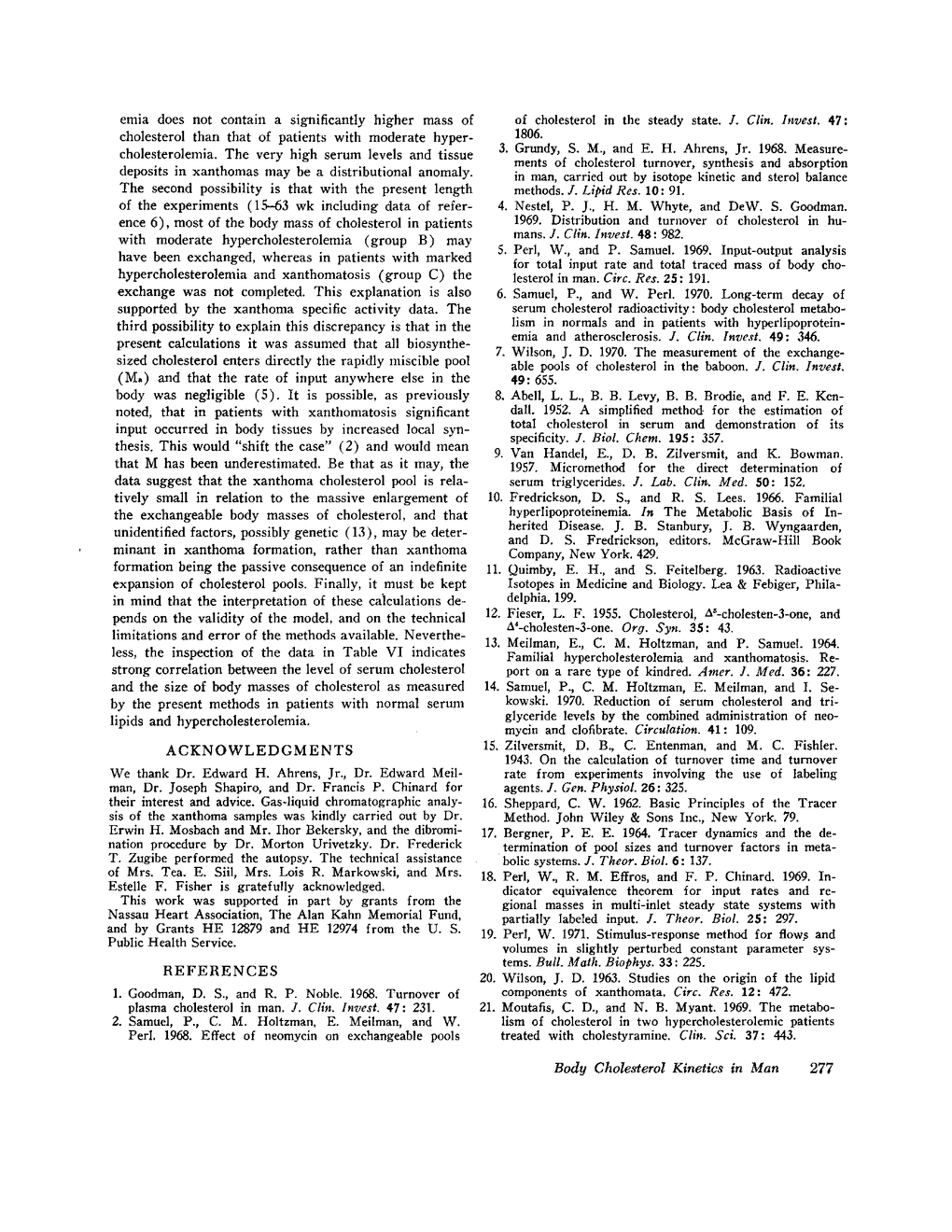 In four patients with hypercholesterolemia (type II hyperlipoproteinemia) and xanthomatosis the decay of serum cholesterol specific activity was followed for 53-63 wk after pulse labeling. Specific activity of biopsied xanthoma cholesterol was measured four times in the course of the study. The xanthoma specific activity curve crossed and thereafter remained above the serum specific activity curve. The average ratio of xanthoma to serum specific activity was 4.7 at the end of the study. The final half-time of the xanthoma decay curves was significantly greater (average: 200 days) than the slowest half-time of serum specific activity decay (average: 93 days). The data were analyzed by input-output analysis and yielded the following results. The average value for the total input rate of body cholesterol (IT) (sum of dietary and biosynthesized cholesterol) was 1.29 g/day. The average size of the rapidly miscible pool of cholesterol (Ma) was 55.7 g. and of the total exchangeable body mass of cholesterol (M) 116.5 g. The average value of M - Ma (remaining exchangeable mass of cholesterol) was 60.8 g. The derived values for exchangeable masses of cholesterol, in the present patients with marked hypercholesterolemia, were significantly larger than in a group of patients with normal serum lipids in previous studies. One of the four patients died of a sudden acute myocardial infarction 53 wk after pulse labeling. Specific activity of aortic wall and atheroma cholesterol was 3.12 times that of serum. The ratio was close to 2 for adipose tissue and spleen, and was slightly above 1 or was close to unity in most other organs studied, with the exception of brain which showed a ratio of 0.19.