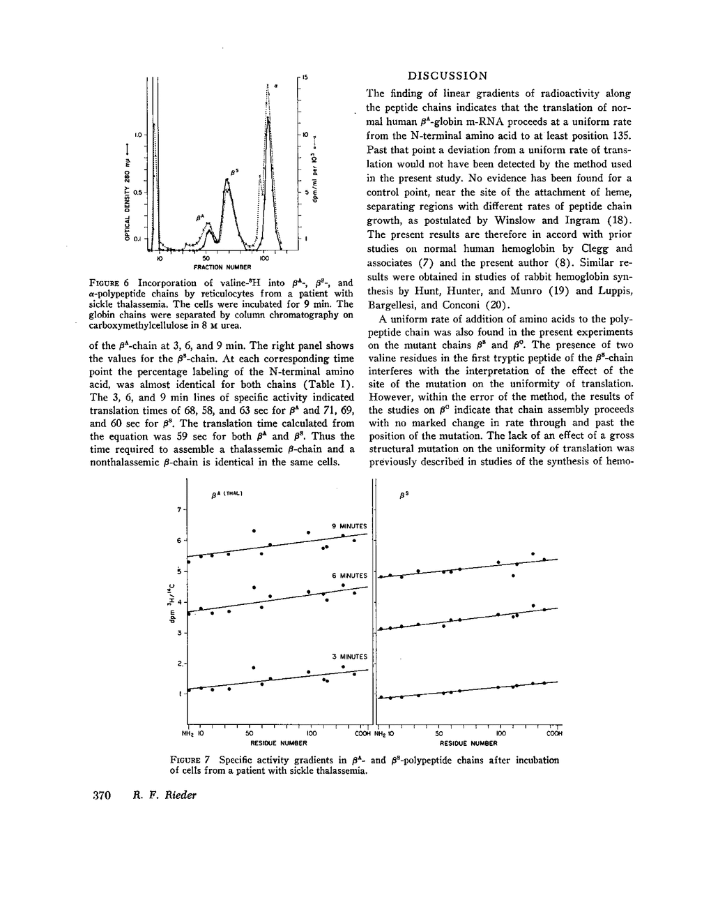 Genetic and biochemical evidence indicates that in β-thalassemia there is impaired synthesis of the β-globin chains of hemoglobin A. In patients heterozygous for the hemoglobinopathies, hemoglobin S and hemoglobin C, the mutant β-chain is produced in smaller amounts than normal βA. Defective m-RNA translation has been suggested as a possible cause of decreased β-globin polypeptide synthesis in thalassemia and the hemoglobinopathies. In the present study, the ribosomal assembly of β-globin chains was examined in the peripheral, nucleated red blood cells and reticulocytes of patients with Cooley's anemia, thalassemia intermedia, sickle thalassemia, sickle cell anemia, hemoglobin C disease, and in hemolytic anemias not associated with a hemoglobinopathy. The translation times of βA, βS, and βC did not differ significantly (average times; βA = 75 sec, range 43-114, βS = 69 sec, βC = 92 sec). In thalassemia, no evidence was found for a delay in translation as the cause of the marked impairment of β-globin synthesis. In several specimens of peripheral blood from thalassemic patients, the translation time of the β-chain was even shorter than in nonthalassemic specimens (average time = 45 sec, range 35-59). The results suggest that the defect in β-globin synthesis in β-thalassemia is due to impaired initiation of β-globin chain assembly or a quantitative deficiency in m-RNA.