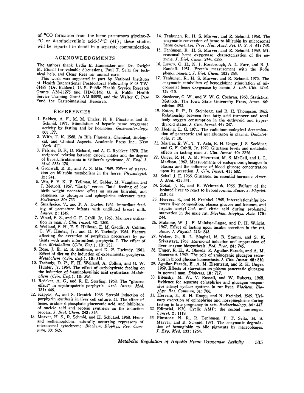 Heme oxygenase (HO), the enzyme system catalyzing the conversion of heme to bilirubin, was studied in the liver and spleen of fed, fasted, and refed rats. Fasting up to 72 hr resulted in a threefold increase in hepatic HO activity, while starvation beyond this period led to a gradual decline in enzyme activity. Refeeding of rats fasted for 48 hr depressed hepatic HO activity to basal values within 24 hr. Splenic HO was unaffected by fasting and refeeding.