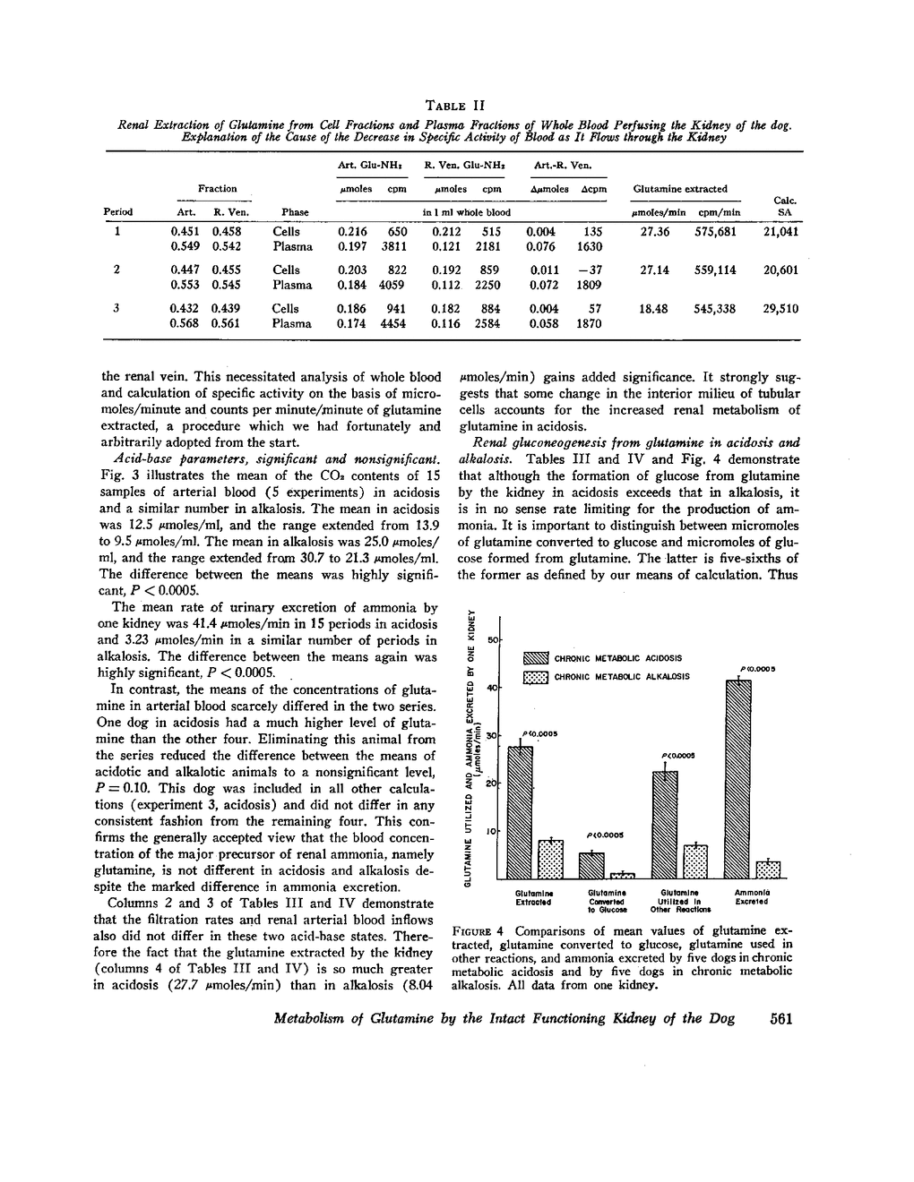 The renal conversion of glutamine to glucose and its oxidation to CO2 were compared in dogs in chronic metabolic acidosis and alkalosis. These studies were performed at normal endogenous levels of glutamine utilizing glutamine-34C (uniformly labeled) as a tracer. It was observed in five experiments in acidosis that mean renal extraction of glutamine by one kidney amounted to 27.7 μmoles/min. Of this quantity, 5.34 μmoles/min was converted to glucose, and 17.5 μmoles/min was oxidized to CO2. Acidotic animals excreted an average of 41 μmoles/min of ammonia in the urine formed by one kidney. In contrast, in five experiments in alkalosis, mean renal extraction of glutamine amounted to 8.04 μmoles/min. Of this quantity, 0.92 μmole/min was converted to glucose, and 4.99 μmoles/min was oxidized to CO2. Alkalotic animals excreted an average of 3.23 μmoles/min of ammonia in the urine. We conclude that renal gluconeogenesis is not rate limiting for the production and excretion of ammonia in either acidosis or alkalosis. Since 40% of total CO2 production is derived from oxidation of glutamine by the acidotic kidney and 14% by the alkalotic kidney, it is apparent that renal energy sources change with acid-base state and that glutamine constitutes a major metabolic fuel in acidosis.
