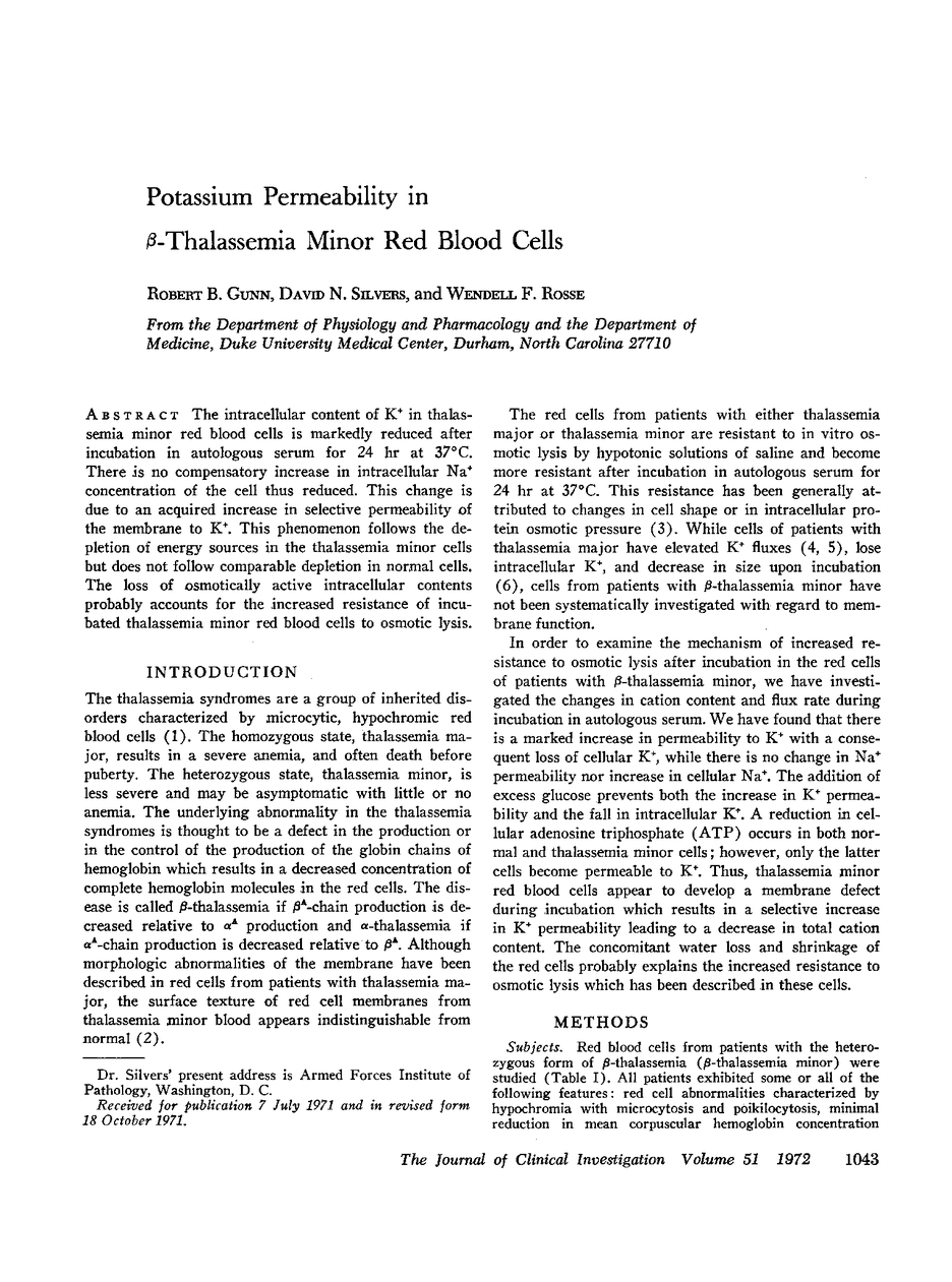 The intracellular content of K+ in thalassemia minor red blood cells is markedly reduced after incubation in autologous serum for 24 hr at 37°C. There is no compensatory increase in intracellular Na+ concentration of the cell thus reduced. This change is due to an acquired increase in selective permeability of the membrane to K+. This phenomenon follows the depletion of energy sources in the thalassemia minor cells but does not follow comparable depletion in normal cells. The loss of osmotically active intracellular contents probably accounts for the increased resistance of incubated thalassemia minor red blood cells to osmotic lysis.