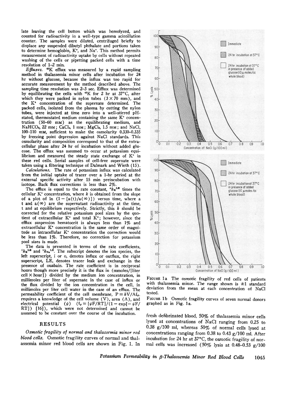 The intracellular content of K+ in thalassemia minor red blood cells is markedly reduced after incubation in autologous serum for 24 hr at 37°C. There is no compensatory increase in intracellular Na+ concentration of the cell thus reduced. This change is due to an acquired increase in selective permeability of the membrane to K+. This phenomenon follows the depletion of energy sources in the thalassemia minor cells but does not follow comparable depletion in normal cells. The loss of osmotically active intracellular contents probably accounts for the increased resistance of incubated thalassemia minor red blood cells to osmotic lysis.
