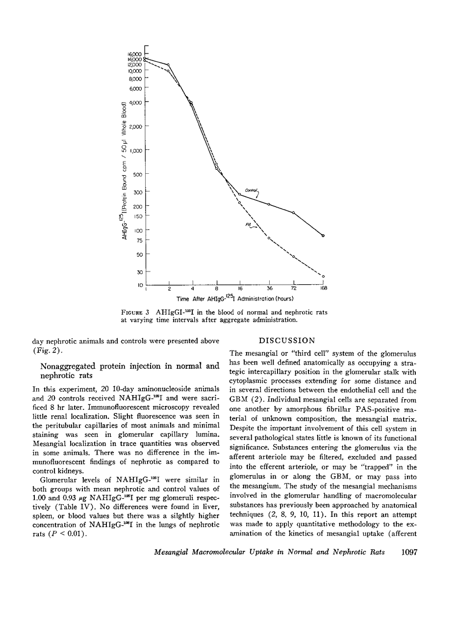 This study was designed to define quantitatively the function of the rat glomerular mesangium in the uptake and processing of intravenously administered protein macromolecules (radiolabeled aggregated human IgG, AHIgG-125I), to relate this function to that of the general reticuloendothelial system, and to examine the effects of increased glomerular permeability to protein on the mesangial cell system.