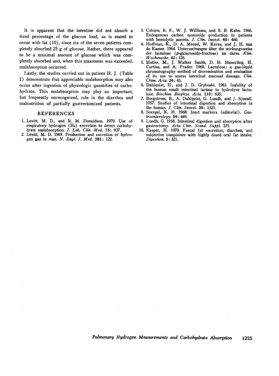 A technique was developed to quantitate the absorption of ingested carbohydrate by means of continuous measurements of pulmonary H2 excretion. This technique is based on the observation that H2 is produced in the colon when carbohydrate is fermented by colonic bacteria, and this H2 is then excreted by the lungs. The quantitative relationship of pulmonary H2 excretion to unabsorbed carbohydrate was studied in nine subjects. After ingestion of 6.5, 13, and 26 g of lactulose (a nonabsorbable disaccharide), H2 excretion increased linearly, averaging (±1 SEM) 13±3.5, 23±7.2, and 49±7 ml per 2 hr. Because of consistent individual differences in H2 excretion per gram of lactulose, the variability of this linear response was less in a given subject, with the H2 excretion after 6.5 g and 26 g lactulose dosages averaging 55±4.2% and 214±16% of that observed after the 13 g dose. It was further demonstrated with fecal homogenates, as well as in rats after direct intracecal instillation of carbohydrate, that there was no significant difference in the rate of H2 formation from lactulose as compared with the normally ingested sugars. Thus, a subject's H2 excretion after a 13 g dose of lactulose can be used as a standard to convert H2 excretion after ingestion of other carbohydrates into grams of carbohydrate not absorbed. Application of this technique to seven partially gastrectomized patients indicated all subjects malabsorbed a portion of a 100 g dose of glucose whereas six of seven completely absorbed a 25 g dose. Malabsorption of physiologic quantities of various carbohydrates was clearly demonstrated in one subject. This technique appears to provide quantitative information on carbohydrate malabsorption not readily obtained by presently available techniques.