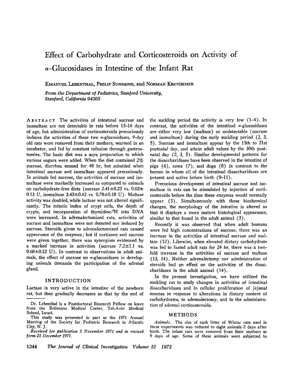 The activities of intestinal sucrase and isomaltase are not detectable in rats before 15-16 days of age, but administration of corticosteroids precociously induces the activities of these two α-glucosidases. 9-day old rats were removed from their mothers, warmed in an incubator, and fed by constant infusion through gastrostomies. The basic diet was a soya preparation to which various sugars were added. When the diet contained 2% sucrose, diarrhea ensued for 48 hr, but subsided when intestinal sucrase and isomaltase appeared precociously. In animals fed sucrose, the activities of sucrase and isomaltase were markedly increased as compared to animals on carbohydrate-free diets (sucrase 2.41±0.23 vs. 0.63±0.13 U, isomaltase 3.43±0.42 vs. 0.78±0.18 U). Maltase activity was doubled, while lactase was not altered significantly. The mitotic index of crypt cells, the depth of crypts, and incorporation of thymidine-3H into DNA were increased. In adrenalectomized rats, activities of sucrase and isomaltase were not detected nor induced by sucrose. Steroids given to adrenalectomized rats caused appearance of the enzymes; but if cortisone and sucrose were given together, there was synergism evidenced by a marked increase in activities (sucrase 7.2±1.1 vs. 0.68±0.12 U). In contrast to observations in adult animals, the effect of sucrose on α-glucosidases in developing animals demands the participation of the adrenal gland.