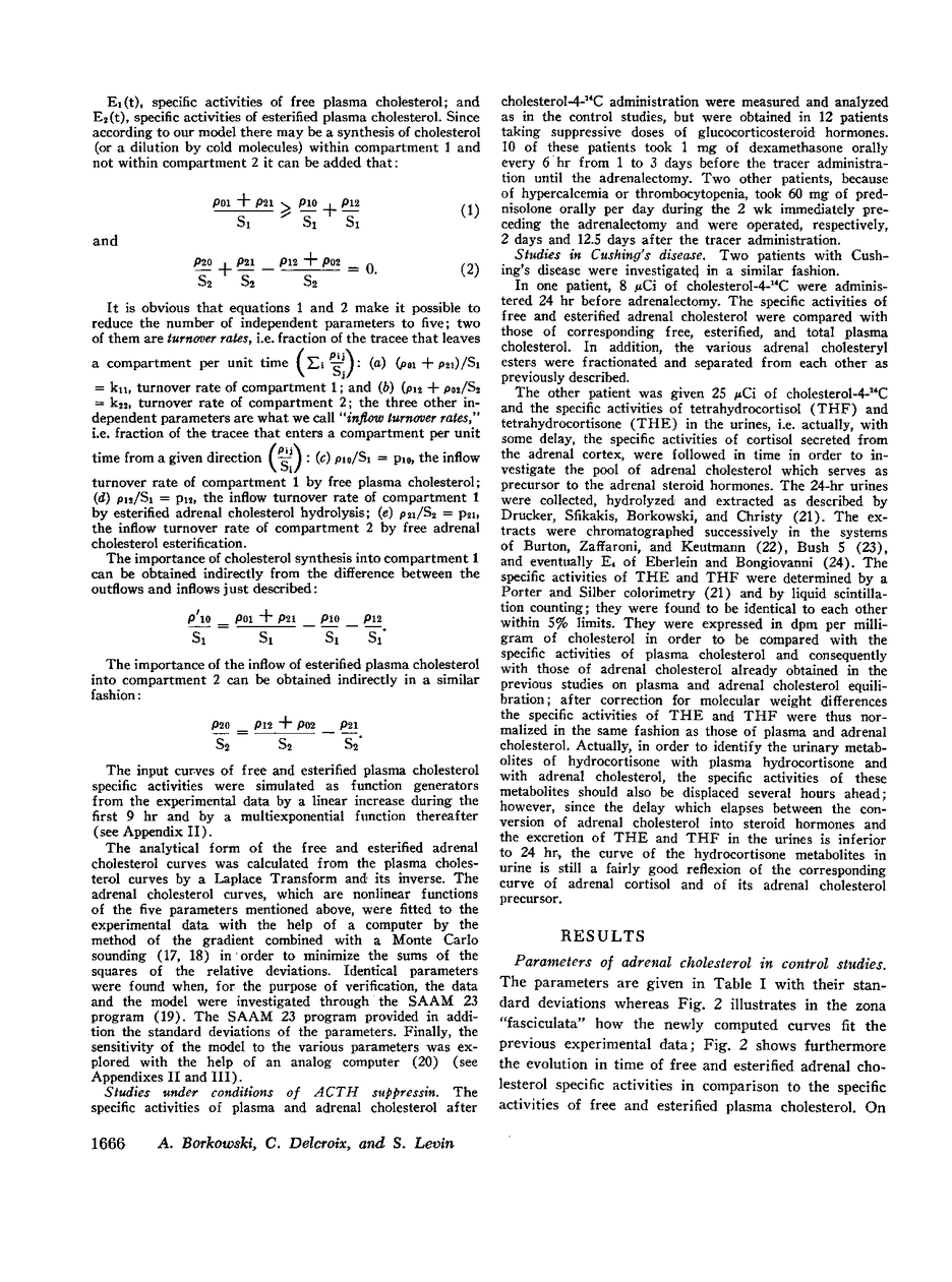The kinetics of plasma and adrenal cholesteral equilibration were analyzed in patients undergoing bilateral adrenalectomy for generalized mammary carcinoma. A biological model is proposed to help in the understanding of adrenal cholesterol physiology. It comprises two intracellular compartments: (1) A compartment of free adrenal cholesterol which is small (of the order of 17 mg) but turns over very fast; it is renewed approximately 8 times per day: 3 times by the inflow of free plasma cholesterol, and 5 times by the hydrolysis of esterified adrenal cholesterol, the contribution of adrenal cholesterol synthesis appearing to be relatively small. (2) A compartment of esterified adrenal cholesterol which is 20 times larger; it is constantly renewed by in situ esterification and hydrolysis with a daily fractional turnover rate of the order of 0.25. The direct and selective accumulation of plasma cholesteryl esters is practically absent. Only free adrenal cholesterol returns to plasma, mostly after conversion into steroid “hormones.”