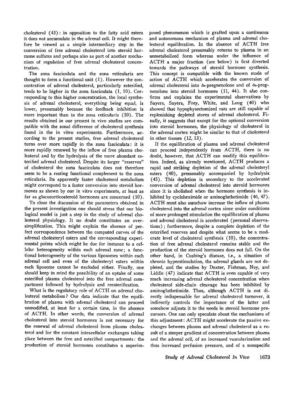 The kinetics of plasma and adrenal cholesteral equilibration were analyzed in patients undergoing bilateral adrenalectomy for generalized mammary carcinoma. A biological model is proposed to help in the understanding of adrenal cholesterol physiology. It comprises two intracellular compartments: (1) A compartment of free adrenal cholesterol which is small (of the order of 17 mg) but turns over very fast; it is renewed approximately 8 times per day: 3 times by the inflow of free plasma cholesterol, and 5 times by the hydrolysis of esterified adrenal cholesterol, the contribution of adrenal cholesterol synthesis appearing to be relatively small. (2) A compartment of esterified adrenal cholesterol which is 20 times larger; it is constantly renewed by in situ esterification and hydrolysis with a daily fractional turnover rate of the order of 0.25. The direct and selective accumulation of plasma cholesteryl esters is practically absent. Only free adrenal cholesterol returns to plasma, mostly after conversion into steroid “hormones.”