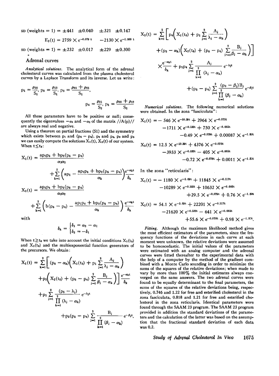 The kinetics of plasma and adrenal cholesteral equilibration were analyzed in patients undergoing bilateral adrenalectomy for generalized mammary carcinoma. A biological model is proposed to help in the understanding of adrenal cholesterol physiology. It comprises two intracellular compartments: (1) A compartment of free adrenal cholesterol which is small (of the order of 17 mg) but turns over very fast; it is renewed approximately 8 times per day: 3 times by the inflow of free plasma cholesterol, and 5 times by the hydrolysis of esterified adrenal cholesterol, the contribution of adrenal cholesterol synthesis appearing to be relatively small. (2) A compartment of esterified adrenal cholesterol which is 20 times larger; it is constantly renewed by in situ esterification and hydrolysis with a daily fractional turnover rate of the order of 0.25. The direct and selective accumulation of plasma cholesteryl esters is practically absent. Only free adrenal cholesterol returns to plasma, mostly after conversion into steroid “hormones.”