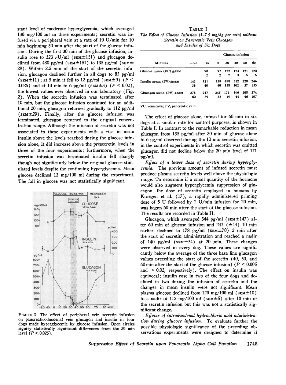 Highly purified secretin, infused endoportally in five conscious mongrel dogs at a rate of 10 clinical units per min for 20 min, caused a prompt and statistically significant reduction in the pancreaticoduodenal vein level of pancreatic glucagon from a control average of 1130 pg/ml (SEM±312) to a nadir of 492 pg/ml (SEM±194) 15 min later (P < 0.01). During modest hyperglycemia of about 130 mg/100 ml, induced by glucose infusion, the infusion of secretin at the same rate elicited even more dramatic suppression of pancreaticoduodenal glucagon levels to virtually unmeasurable concentrations. At a lower rate of infusion (5 U priming injection followed by 1 U/min for 20 min) significant suppression of glucagon secretion during hyperglycemia was also observed. Stimulation of endogenous secretin release by the intraduodenal administration of 14 mEq of HCl in 10 dogs during intravenous glucose infusion was followed by a decline in pancreaticoduodenal vein glucagon from 130 pg/ml (SEM±34) to a nadir of 99 pg/ml (SEM±32) 5 min later (P < 0.05).