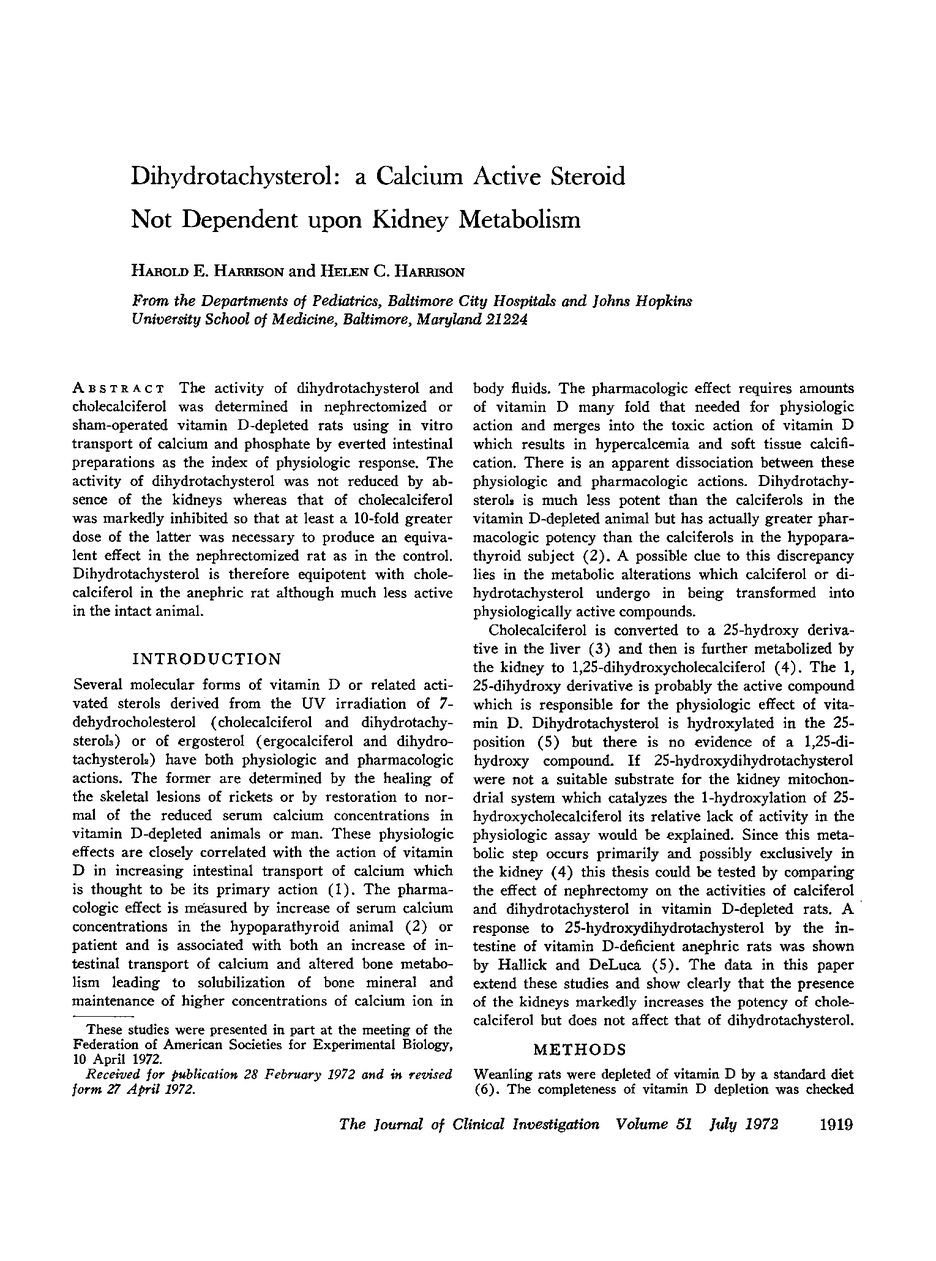 The activity of dihydrotachysterol and cholecalciferol was determined in nephrectomized or sham-operated vitamin D-depleted rats using in vitro transport of calcium and phosphate by everted intestinal preparations as the index of physiologic response. The activity of dihydrotachysterol was not reduced by absence of the kidneys whereas that of cholecalciferol was markedly inhibited so that at least a 10-fold greater dose of the latter was necessary to produce an equivalent effect in the nephrectomized rat as in the control. Dihydrotachysterol is therefore equipotent with cholecalciferol in the anephric rat although much less active in the intact animal.