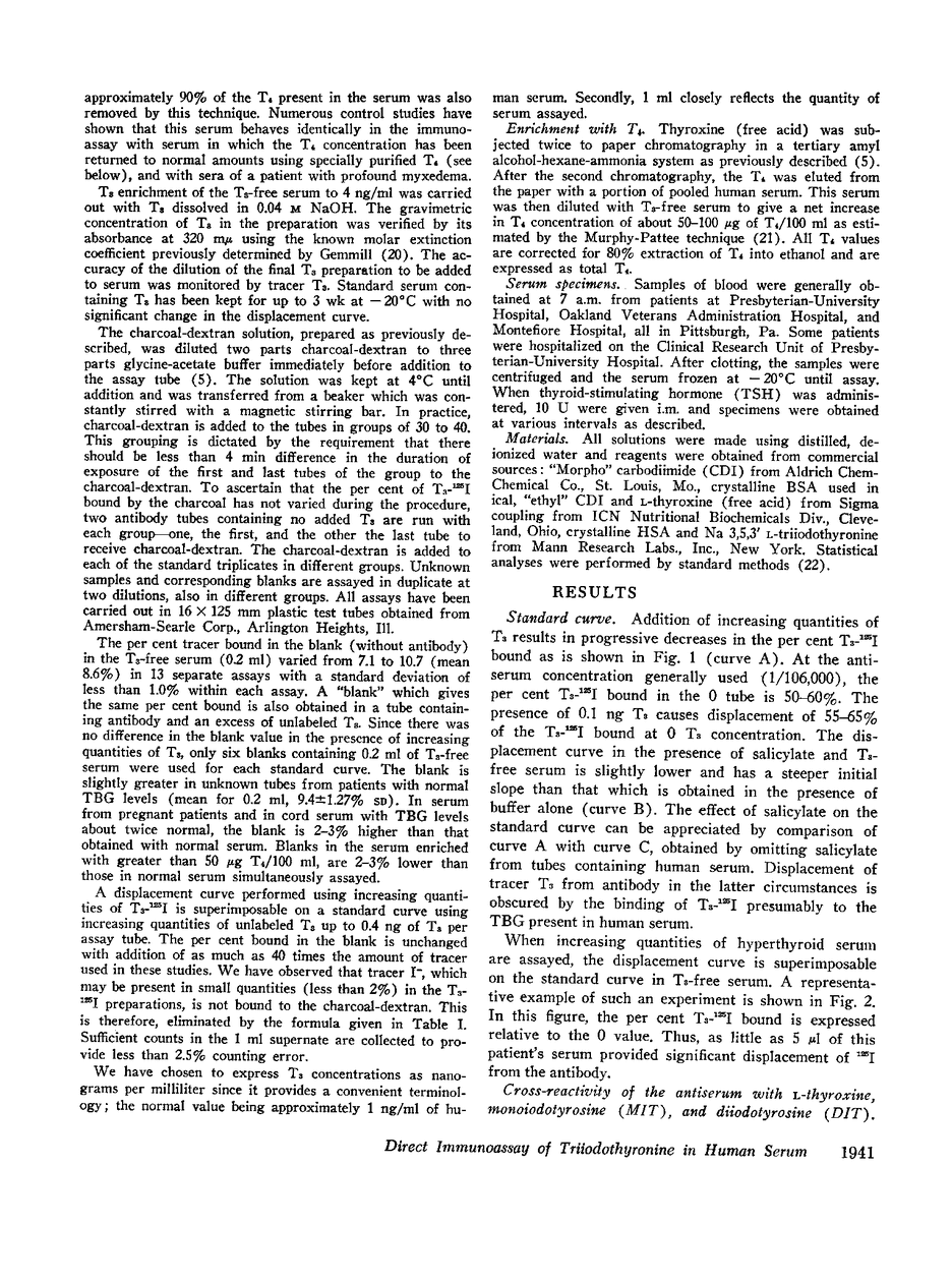 A sensitive and precise radioimmunoassay for the direct measurement of triiodothyronine (T3) in human serum has been designed using sodium salicylate to block T3-TBG binding. This assay is sufficiently sensitive to quantitate T3 accurately in 50-100 μl of normal serum and to measure quantities as small as 12.5 pg in 0.2 ml of hypothyroid serum. The T3 values observed in euthyroid subjects and in patients with various thyroid diseases are as follows: euthyroid (38) 1.10±0.25 (SD) ng/ml, hypothyroid (25) 0.39±0.21 (SD) ng/ml, and hyperthyroid (24) 5.46±4.42 (SD) ng/ml. The levels of T3 parallel the thyroxine (T4) concentration in the sera of these subjects. In eight pregnant women at the time of delivery, T3 concentrations were in the upper normal range (mean 1.33 ng/ml). The levels of T3 in cord serum obtained at the time of delivery of these patients (mean 0.53 ng/ml) are distinctly lower and close to the hypothyroid mean.