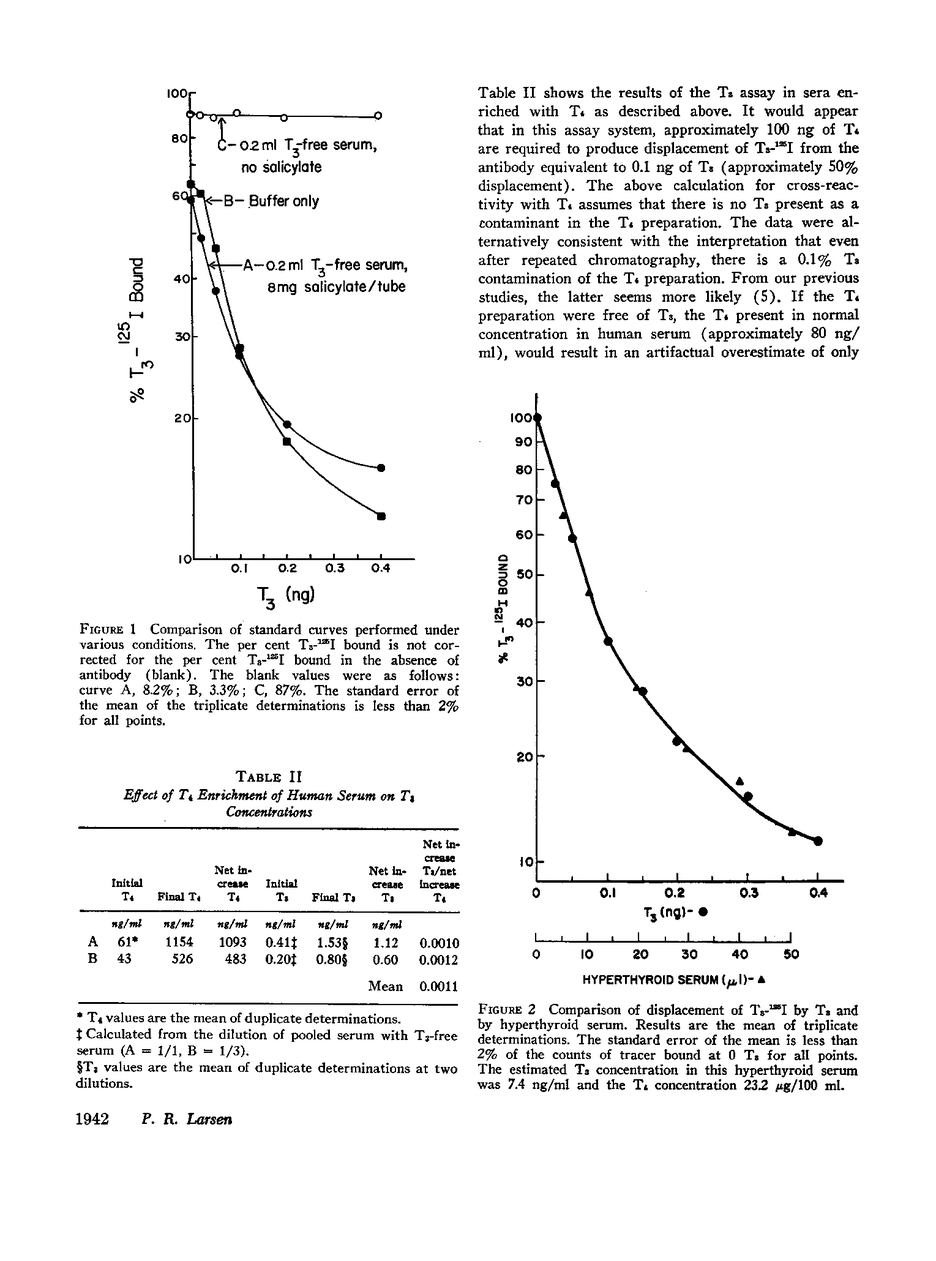 A sensitive and precise radioimmunoassay for the direct measurement of triiodothyronine (T3) in human serum has been designed using sodium salicylate to block T3-TBG binding. This assay is sufficiently sensitive to quantitate T3 accurately in 50-100 μl of normal serum and to measure quantities as small as 12.5 pg in 0.2 ml of hypothyroid serum. The T3 values observed in euthyroid subjects and in patients with various thyroid diseases are as follows: euthyroid (38) 1.10±0.25 (SD) ng/ml, hypothyroid (25) 0.39±0.21 (SD) ng/ml, and hyperthyroid (24) 5.46±4.42 (SD) ng/ml. The levels of T3 parallel the thyroxine (T4) concentration in the sera of these subjects. In eight pregnant women at the time of delivery, T3 concentrations were in the upper normal range (mean 1.33 ng/ml). The levels of T3 in cord serum obtained at the time of delivery of these patients (mean 0.53 ng/ml) are distinctly lower and close to the hypothyroid mean.