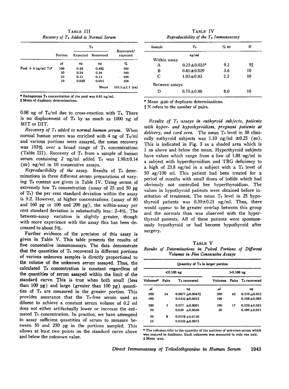 A sensitive and precise radioimmunoassay for the direct measurement of triiodothyronine (T3) in human serum has been designed using sodium salicylate to block T3-TBG binding. This assay is sufficiently sensitive to quantitate T3 accurately in 50-100 μl of normal serum and to measure quantities as small as 12.5 pg in 0.2 ml of hypothyroid serum. The T3 values observed in euthyroid subjects and in patients with various thyroid diseases are as follows: euthyroid (38) 1.10±0.25 (SD) ng/ml, hypothyroid (25) 0.39±0.21 (SD) ng/ml, and hyperthyroid (24) 5.46±4.42 (SD) ng/ml. The levels of T3 parallel the thyroxine (T4) concentration in the sera of these subjects. In eight pregnant women at the time of delivery, T3 concentrations were in the upper normal range (mean 1.33 ng/ml). The levels of T3 in cord serum obtained at the time of delivery of these patients (mean 0.53 ng/ml) are distinctly lower and close to the hypothyroid mean.