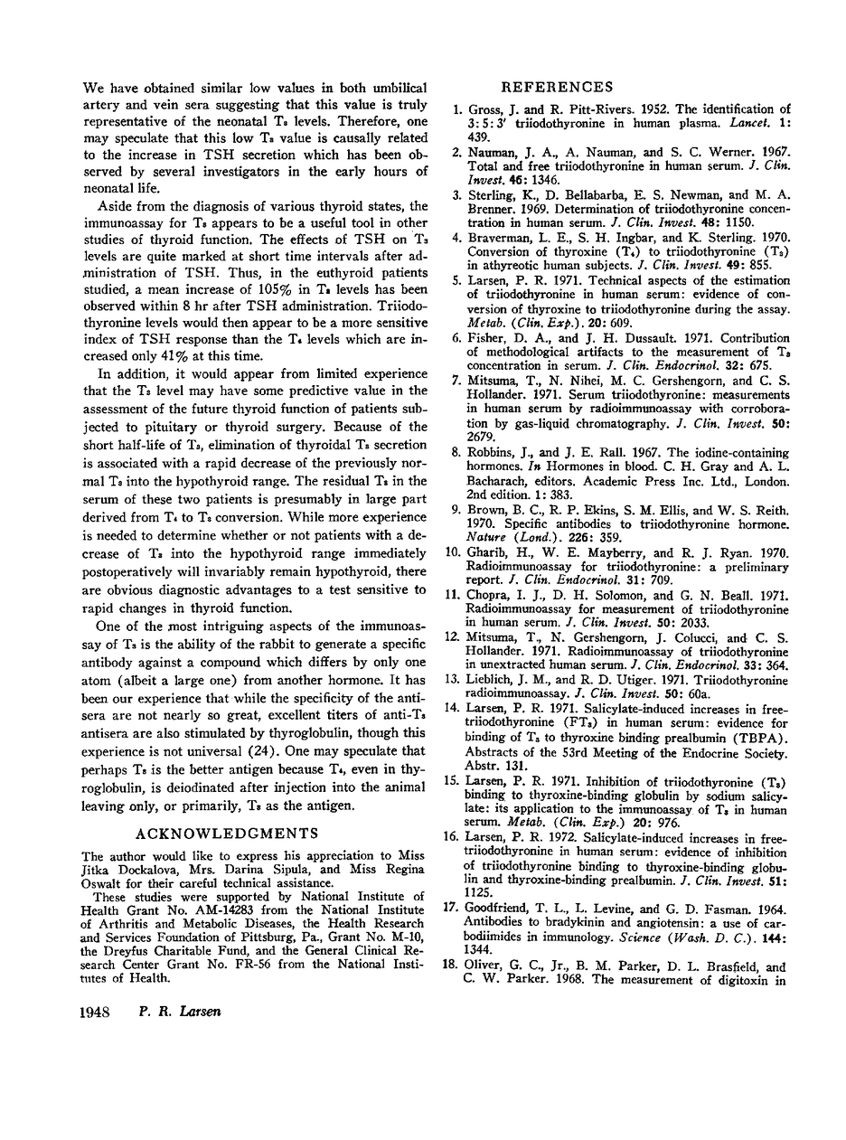 A sensitive and precise radioimmunoassay for the direct measurement of triiodothyronine (T3) in human serum has been designed using sodium salicylate to block T3-TBG binding. This assay is sufficiently sensitive to quantitate T3 accurately in 50-100 μl of normal serum and to measure quantities as small as 12.5 pg in 0.2 ml of hypothyroid serum. The T3 values observed in euthyroid subjects and in patients with various thyroid diseases are as follows: euthyroid (38) 1.10±0.25 (SD) ng/ml, hypothyroid (25) 0.39±0.21 (SD) ng/ml, and hyperthyroid (24) 5.46±4.42 (SD) ng/ml. The levels of T3 parallel the thyroxine (T4) concentration in the sera of these subjects. In eight pregnant women at the time of delivery, T3 concentrations were in the upper normal range (mean 1.33 ng/ml). The levels of T3 in cord serum obtained at the time of delivery of these patients (mean 0.53 ng/ml) are distinctly lower and close to the hypothyroid mean.