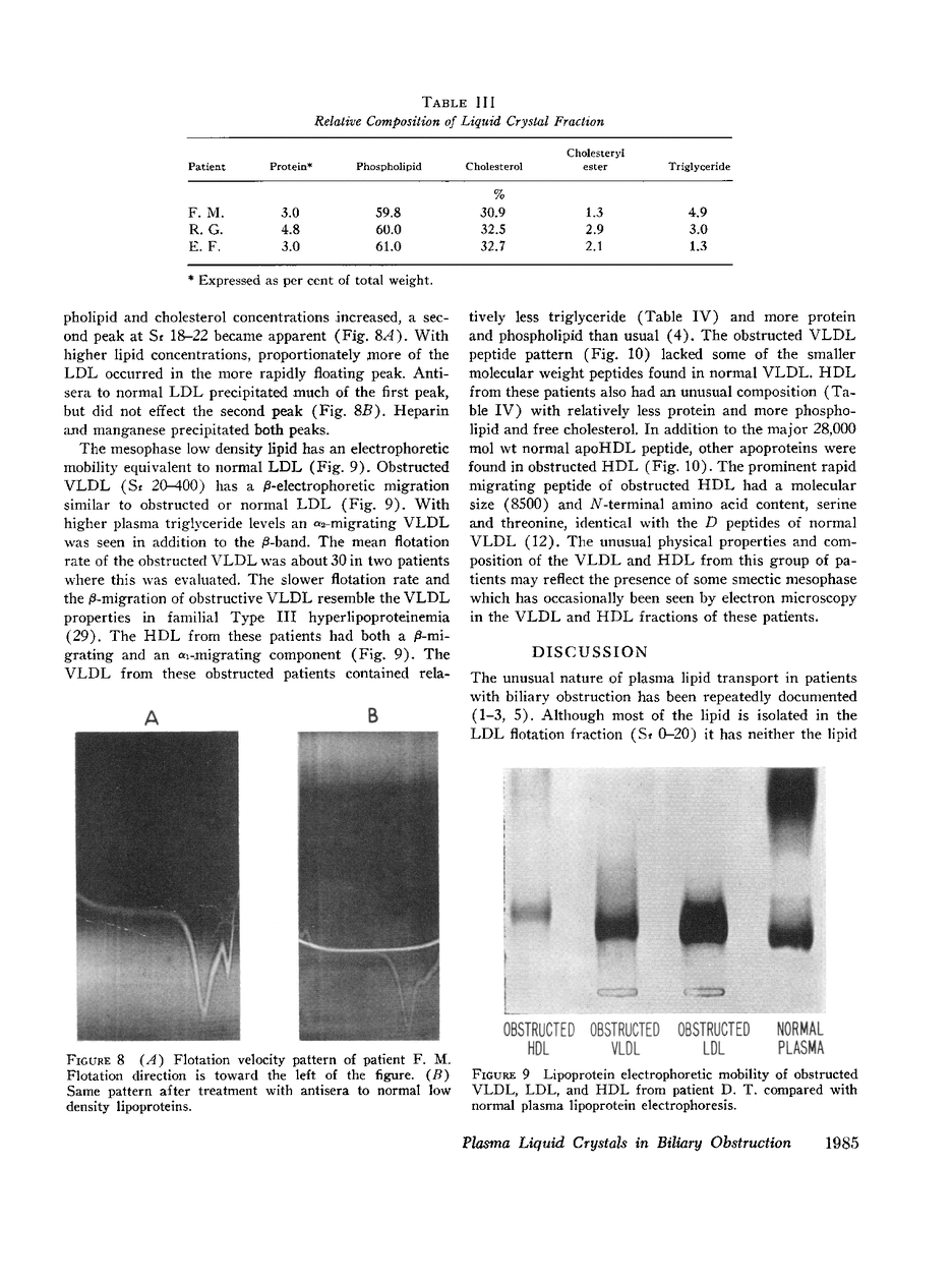 Plasma lipoprotein characteristics were evaluated in a group of patients with obstructed biliary tracts. A 1:1 molar lecithin-free cholesterol liquid crystal phase was observed in the low density flotation region of these patients. The smectic nature of this mesophase was confirmed by electron microscopy, polarized microscopy, and low angle X-ray scattering. A small amount of protein was associated with these liquid crystals, some of which appeared to be components of normal very low and high density lipoproteins. The composition and physical properties of the very low and high density lipoproteins from these obstructed patients differed from normal as well. Aberrant apoprotein patterns were observed for both obstructed very low and high density lipoproteins. A β-electrophoretic migration was observed for a component of these two lipoprotein groups.