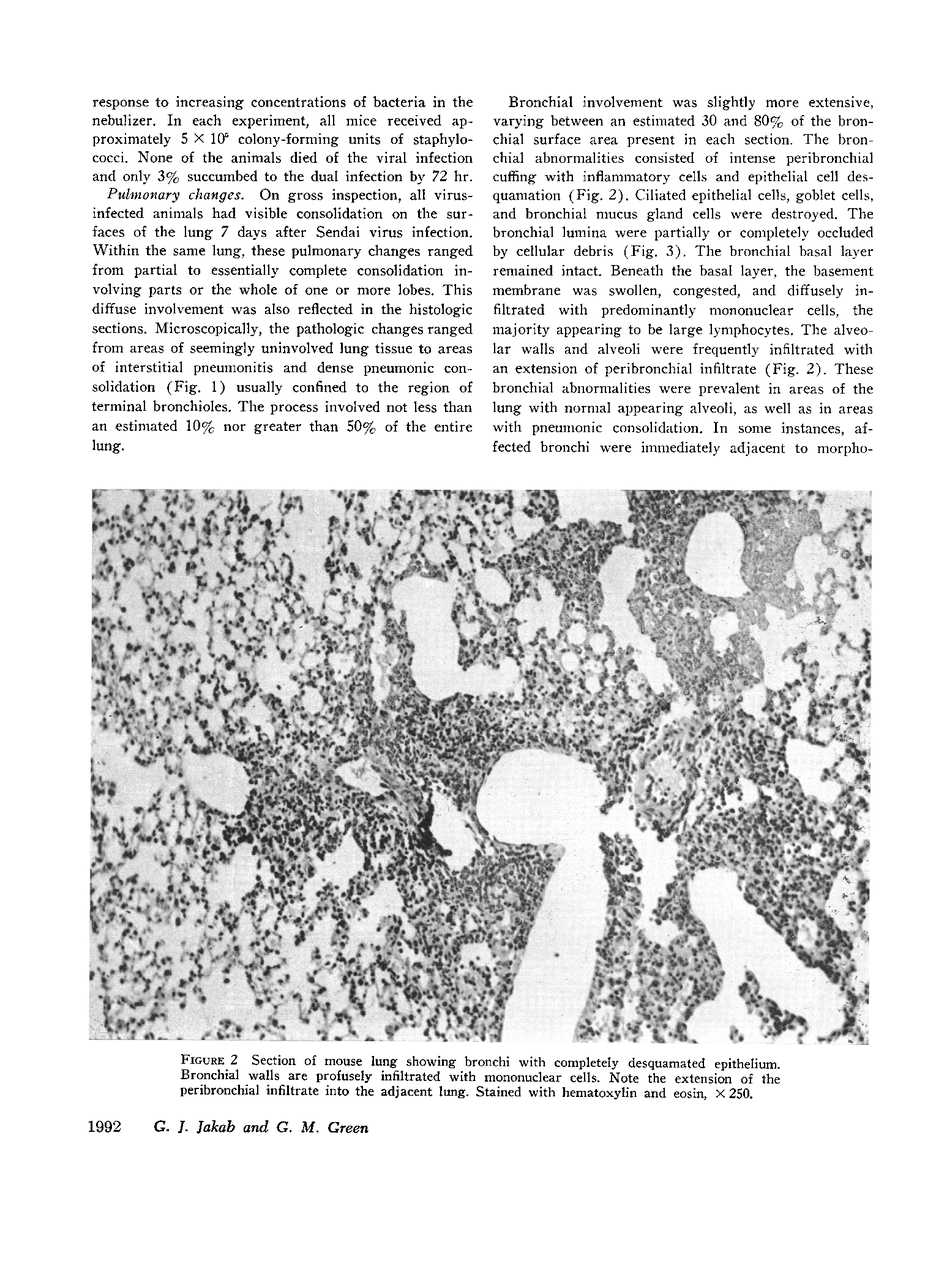 Pulmonary virus infections predispose to bacterial infections in the lung. The mechanism of this effect was studied by quantitative comparison of the effects of airborne acute viral infection on pulmonary transport vs. in situ bactericidal mechanisms in mice. Animals infected by aerosol with 104 TCID50 of Sendai virus developed pathologic pulmonary changes of interstitial pneumonitis, bronchial epithelial desquamation, and peribronchial mononuclear cell infiltration 7 days later. At that time, the mice were challenged with an aerosol of viable 32P-labeled Staphylococcus aureus. Pulmonary bactericidal activity and physical transport by the lung were determined by the determination of viable staphylococcal and 32P radiotracer counts respectively at 4, 24, 48, and 72 hr after bacterial challenge. Infected mice showed a significant decrease from normal in the rate of reduction of viable bacterial counts in the first 4 hr after challenge followed by a proliferation of the staphylococci. By contrast, radiotracer removal rates at 4 and 24 hr were similar in infected and noninfected mice. There was a small but significant retention of 32P in the lungs of the infected animals at the later periods. These data demonstrate that bacterial multiplication associated with virus infection of lungs is related to defects in in situ bactericidal (phagocytic) mechanisms rather than transport mechanisms of the lung, despite histologic evidence of extensive destruction of bronchial-ciliated epithelium.