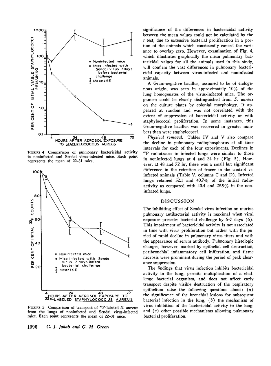 Pulmonary virus infections predispose to bacterial infections in the lung. The mechanism of this effect was studied by quantitative comparison of the effects of airborne acute viral infection on pulmonary transport vs. in situ bactericidal mechanisms in mice. Animals infected by aerosol with 104 TCID50 of Sendai virus developed pathologic pulmonary changes of interstitial pneumonitis, bronchial epithelial desquamation, and peribronchial mononuclear cell infiltration 7 days later. At that time, the mice were challenged with an aerosol of viable 32P-labeled Staphylococcus aureus. Pulmonary bactericidal activity and physical transport by the lung were determined by the determination of viable staphylococcal and 32P radiotracer counts respectively at 4, 24, 48, and 72 hr after bacterial challenge. Infected mice showed a significant decrease from normal in the rate of reduction of viable bacterial counts in the first 4 hr after challenge followed by a proliferation of the staphylococci. By contrast, radiotracer removal rates at 4 and 24 hr were similar in infected and noninfected mice. There was a small but significant retention of 32P in the lungs of the infected animals at the later periods. These data demonstrate that bacterial multiplication associated with virus infection of lungs is related to defects in in situ bactericidal (phagocytic) mechanisms rather than transport mechanisms of the lung, despite histologic evidence of extensive destruction of bronchial-ciliated epithelium.
