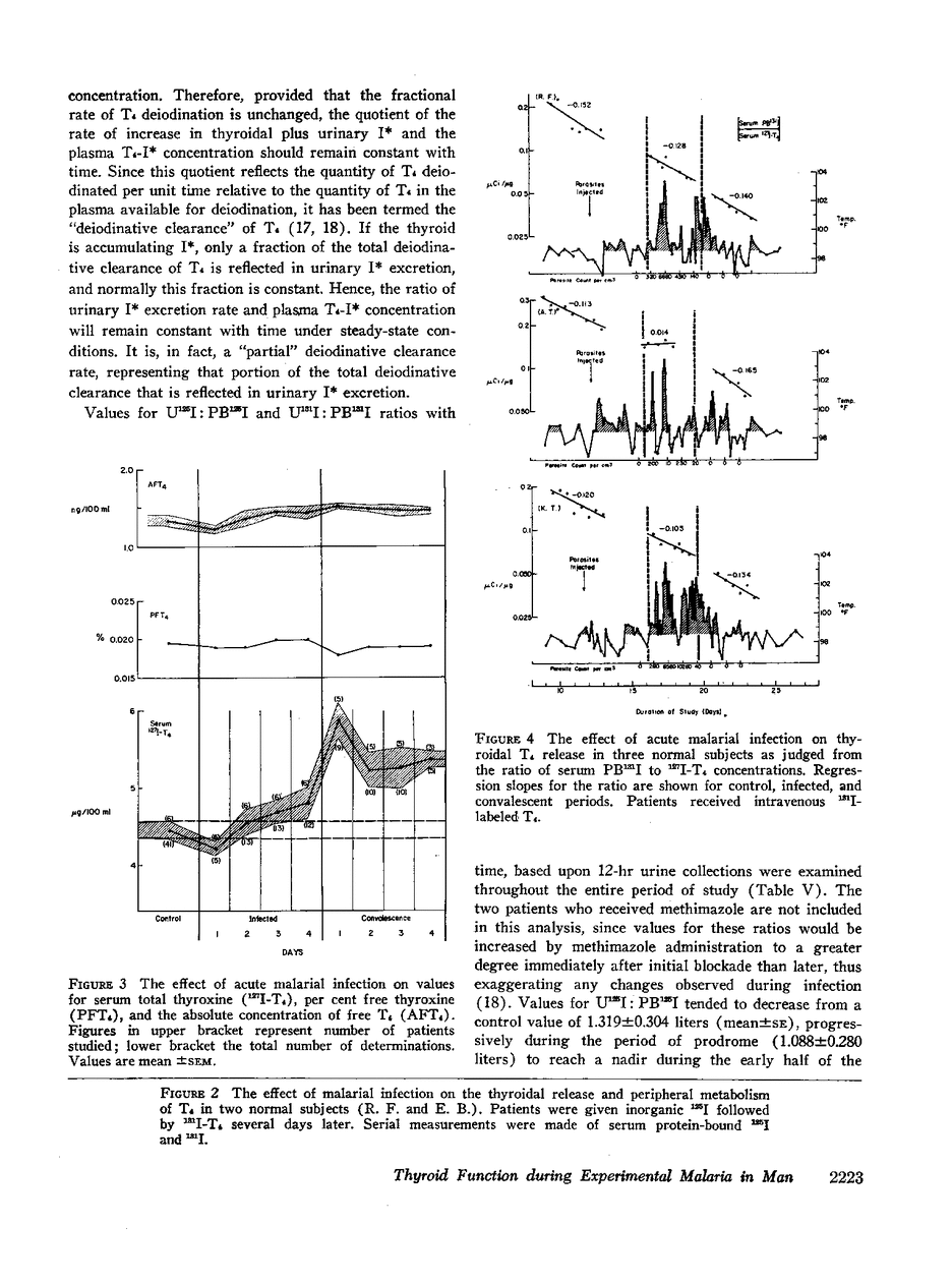 Previous studies of thyroid function during various infections have yielded conflicting results, but most have suggested an acceleration of peripheral thyroxine (T4) turnover during the acute infectious illness. In the present studies, thyroid function was examined by a method allowing simultaneous analysis of both endogenous thyroidal release and peripheral T4 disposal in normal volunteers after induction of acute falciparum malaria. Subjects received iodide-125I, followed in 5-7 days by 131I-T4 intravenously. 4 days later, infection was induced by the injection of parasitized red blood cells. Bidaily measurements of serum protein-bound 125I and protein-bound 131I, and urinary 125I and 131I, together with frequent estimates of serum 127I-T4 (Murphy-Pattee) and free T4 (FT4), were made during a control period, during acute illness, and during convalescence. Alterations in the peripheral metabolism of 131I-T4 during infection included significant decreases in the fractional disappearance rate for T4 [(k)], and in the clearance and daily disposal of T4, all of which returned to control values during convalescence. Total serum 127I-T4 increased late in the infected period to become greater during convalescence than either before or during infection, while FT4 did not increase significantly until convalescence. An analysis of serum 131I-T4/127I-T4 and 131I-T4/PB125I ratios confirmed these observations. The slope with time of ratios for urinary 125I/131I, a reflection of thyroidal iodine release, was decreased during infection, but rebounded to control values during the convalescent period. The observed increments in serum 127I-T4 concentration in the convalescent phase may reflect in part the slowing of (k), but together with the rising ratios of urine 125I/131I suggests enhanced thyroidal T4 secretion immediately after the acute illness. Thus, with malarial infection, there appears to be an initial depression followed by a rebound in rates of thyroidal iodine release. In contradistinction to other infections, fractional turnover and daily disposal of hormone is decreased in malaria, perhaps due to hepatic dysfunction and the consequent impairment in cellular deiodinative processes.