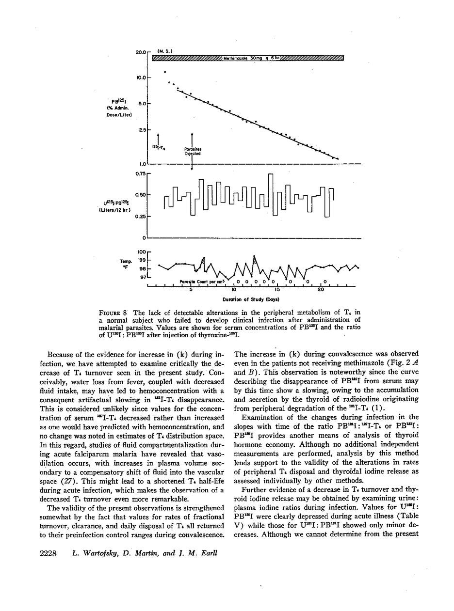Previous studies of thyroid function during various infections have yielded conflicting results, but most have suggested an acceleration of peripheral thyroxine (T4) turnover during the acute infectious illness. In the present studies, thyroid function was examined by a method allowing simultaneous analysis of both endogenous thyroidal release and peripheral T4 disposal in normal volunteers after induction of acute falciparum malaria. Subjects received iodide-125I, followed in 5-7 days by 131I-T4 intravenously. 4 days later, infection was induced by the injection of parasitized red blood cells. Bidaily measurements of serum protein-bound 125I and protein-bound 131I, and urinary 125I and 131I, together with frequent estimates of serum 127I-T4 (Murphy-Pattee) and free T4 (FT4), were made during a control period, during acute illness, and during convalescence. Alterations in the peripheral metabolism of 131I-T4 during infection included significant decreases in the fractional disappearance rate for T4 [(k)], and in the clearance and daily disposal of T4, all of which returned to control values during convalescence. Total serum 127I-T4 increased late in the infected period to become greater during convalescence than either before or during infection, while FT4 did not increase significantly until convalescence. An analysis of serum 131I-T4/127I-T4 and 131I-T4/PB125I ratios confirmed these observations. The slope with time of ratios for urinary 125I/131I, a reflection of thyroidal iodine release, was decreased during infection, but rebounded to control values during the convalescent period. The observed increments in serum 127I-T4 concentration in the convalescent phase may reflect in part the slowing of (k), but together with the rising ratios of urine 125I/131I suggests enhanced thyroidal T4 secretion immediately after the acute illness. Thus, with malarial infection, there appears to be an initial depression followed by a rebound in rates of thyroidal iodine release. In contradistinction to other infections, fractional turnover and daily disposal of hormone is decreased in malaria, perhaps due to hepatic dysfunction and the consequent impairment in cellular deiodinative processes.