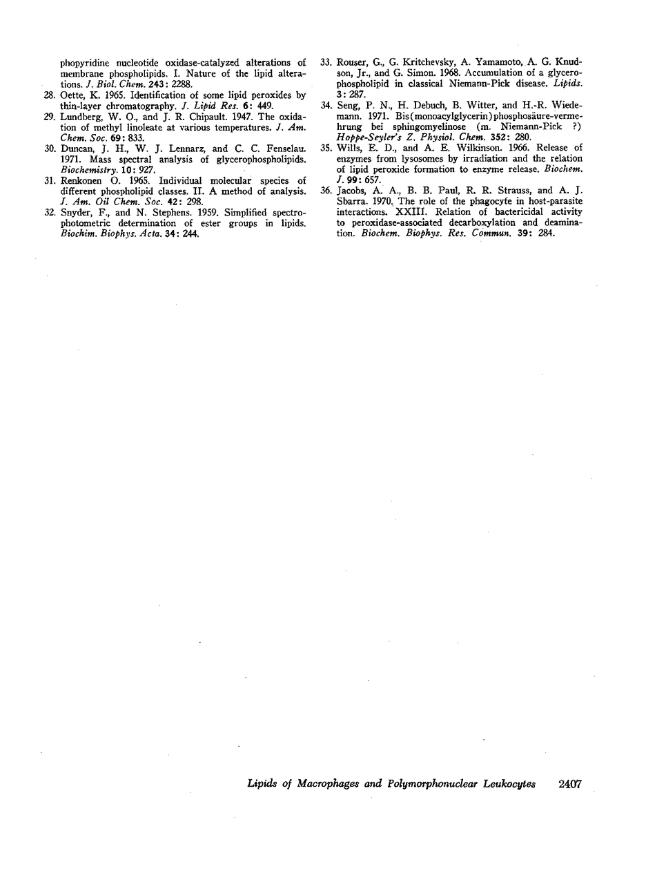 Phagocytic vesicles were isolated from rabbit alveolar macrophages and guinea pig polymorphonuclear leukocytes that had ingested emulsified paraffin oil. Phospholipids and their fatty acids were determined in whole cells and in the phagocytic vesicle and pellet fractions separated from them. The cholesterol-to-phospholipid ratios in the vesicle fractions were distinctly higher than those of the respective whole cells or pellet fractions. The vesicle fractions also had higher phospholipid-to-protein ratios than did the whole cells. The phospholipids of the phagocytic vesicle fraction from macrophages contained relatively more sphingomyelin, lyso-(bis)phosphatidic acid, and phosphatidylserine and less lecithin, phosphatidylethanolamine, and phosphatidylinositol than did the whole cells or pellet fractions. The phospholipids of phagocytic vesicles from polymorphonuclear leukocytes contained significantly more phosphatidylinositol than did the pellet fractions. Lyso(bis)phosphatidic acid, which constituted 15% of the phospholipid in rabbit alveolar macrophages and 25% of that in their phagocytic vesicles, contained almost 60% oleic acid and 20% linoleic acid. This lipid was not detected in rabbit peritoneal macrophages or in rat alveolar macrophages.