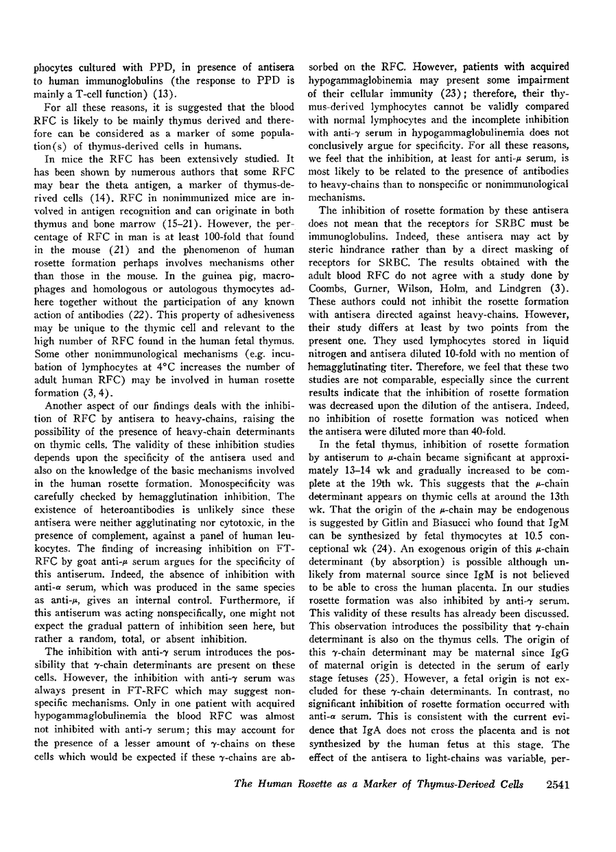Sheep red blood cells can surround, in vitro, some human peripheral blood lymphocytes in a formation called a rosette. The number of rosetteforming cells (RFC) in 50 normal persons had a wide range (4-40%).