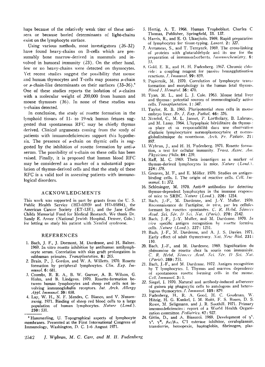 Sheep red blood cells can surround, in vitro, some human peripheral blood lymphocytes in a formation called a rosette. The number of rosetteforming cells (RFC) in 50 normal persons had a wide range (4-40%).