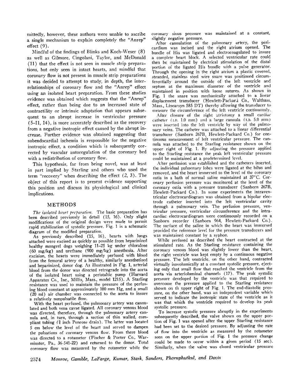 Evidence is presented supporting the hypothesis that the positive inotropic effect after an abrupt increase in systolic pressure (Anrep effect) is the recovery from subendocardial ischemia induced by the increase and subsequently corrected by vascular autoregulation of the coronary bed. Major evidence consists of data obtained from an isolated heart preparation showing that the Anrep effect can be abolished with coronary vasodilation, and that with an abrupt increase in systolic pressure there is a significant reduction in the distribution of coronary flow to subendocardial layers of the ventricle. Furthermore, the intracardiac electrocardiogram shows S-T segment and T wave changes after an abrupt increase in ventricular pressure similar to that noted after coronary constriction. Major implications are that normally there may be ischemia of the subendocardial layers tending to reduce myocardial contractility which may account, in part, for the positive inotropic effect of various coronary vasodilators; that with an abrupt increase in ventricular pressure the subendocardium is rendered temporarily ischemic, placing the heart in jeopardy from arrhythmias until this is corrected; and that end-diastolic pressure and the intracardiac electrocardiogram may provide a means of evaluating the adequacy of circulation to subendocardial layers in diseased ventricles when systolic pressure is abruptly increased.