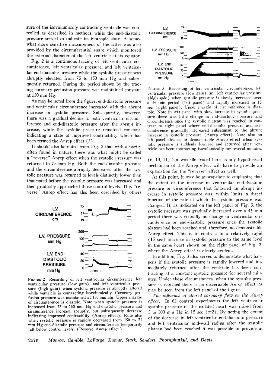 Evidence is presented supporting the hypothesis that the positive inotropic effect after an abrupt increase in systolic pressure (Anrep effect) is the recovery from subendocardial ischemia induced by the increase and subsequently corrected by vascular autoregulation of the coronary bed. Major evidence consists of data obtained from an isolated heart preparation showing that the Anrep effect can be abolished with coronary vasodilation, and that with an abrupt increase in systolic pressure there is a significant reduction in the distribution of coronary flow to subendocardial layers of the ventricle. Furthermore, the intracardiac electrocardiogram shows S-T segment and T wave changes after an abrupt increase in ventricular pressure similar to that noted after coronary constriction. Major implications are that normally there may be ischemia of the subendocardial layers tending to reduce myocardial contractility which may account, in part, for the positive inotropic effect of various coronary vasodilators; that with an abrupt increase in ventricular pressure the subendocardium is rendered temporarily ischemic, placing the heart in jeopardy from arrhythmias until this is corrected; and that end-diastolic pressure and the intracardiac electrocardiogram may provide a means of evaluating the adequacy of circulation to subendocardial layers in diseased ventricles when systolic pressure is abruptly increased.