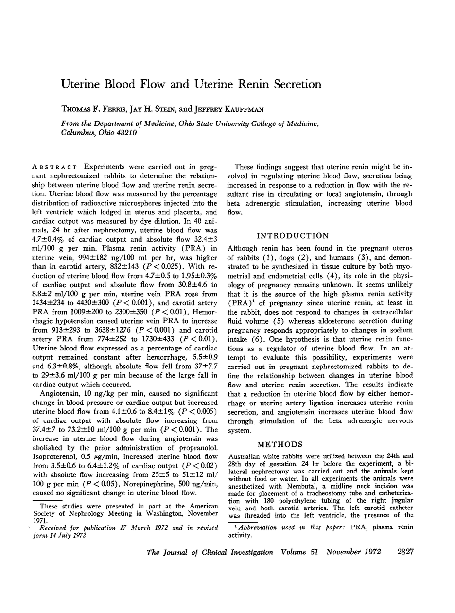Experiments were carried out in pregnant nephrectomized rabbits to determine the relationship between uterine blood flow and uterine renin secretion. Uterine blood flow was measured by the percentage distribution of radioactive microspheres injected into the left ventricle which lodged in uterus and placenta, and cardiac output was measured by dye dilution. In 40 animals, 24 hr after nephrectomy, uterine blood flow was 4.7±0.4% of cardiac output and absolute flow 32.4±3 ml/100 g per min. Plasma renin activity (PRA) in uterine vein, 994±182 ng/100 ml per hr, was higher than in carotid artery, 832±143 (P < 0.025). With reduction of uterine blood flow from 4.7±0.5 to 1.95±0.3% of cardiac output and absolute flow from 30.8±4.6 to 8.8±2 ml/100 g per min, uterine vein PRA rose from 1434±234 to 4430±300 (P < 0.001), and carotid artery PRA from 1009±200 to 2300±350 (P < 0.01). Hemorrhagic hypotension caused uterine vein PRA to increase from 913±293 to 3638±1276 (P < 0.001) and carotid artery PRA from 774±252 to 1730±433 (P < 0.01). Uterine blood flow expressed as a percentage of cardiac output remained constant after hemorrhage, 5.5±0.9 and 6.3±0.8%, although absolute flow fell from 37±7.7 to 29±3.6 ml/100 g per min because of the large fall in cardiac output which occurred.