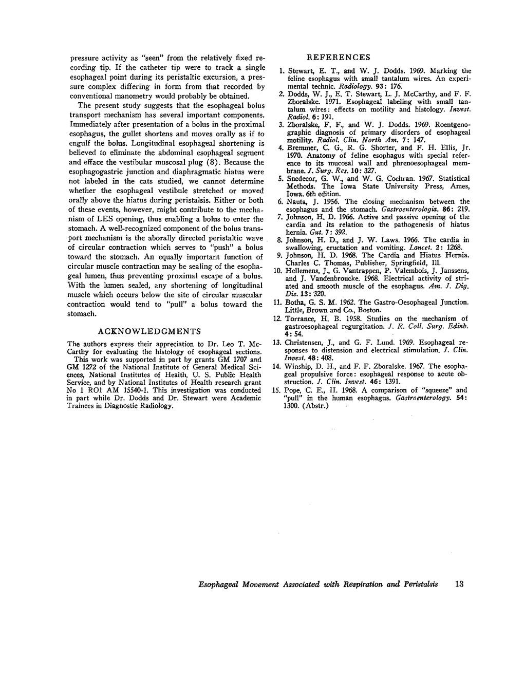 The outer, lateral esophageal walls in the distal half of the esophagus in each of five cats were labeled with small tantalum wires. About 8 wk later, esophageal motion associated with respiration and peristalsis, induced by injecting barium boli (5 ml each) into the proximal esophagus, was recorded on cine and serial biplane roentgenograms while recording intraluminal esophageal pressures simultaneously by manometry. Esophageal motion was also evaluated without a manometric tube in place. The coordinates for each marker were digitized and a computer was used to plot marker position against time. During respiration, the markers passively made a shallow, 2-10 mm excursion on the longitudinal esophageal axis. This movement was synchronous with thoracic and diaphragmatic movement and changes in intraluminal esophageal pressure. Immediately after the onset of peristalsis, the markers made a pronounced oral movement of 10 mm or more above their mean respiratory position, as if to engulf the bolus. Markers in opposing esophageal walls approximated one another and commenced an aboral movement as the bolus tail, which was essentially co-incident with onset of the manometric pressure complex, passed the marker sites. The markers returned to their respective rest positions essentially coincident with passage of the pressure complex peak and then moved below their respective rest positions. The aboral excursion occurred predominantly after the bolus had emptied into the stomach. The magnitude and duration of oral excursion was significantly greater for the distal than for the more proximal markers; conversely, the magnitude and duration of aboral excursion was greater for the proximal than for the more distal markers. During the peristaltic sequence, the labeled portion of the esophagus shortened from 26 to 46% of its resting length. No evidence of esophageal torque was shown. These findings suggest that both the longitudinal and circular esophageal musculature play an active and important role during peristaltic transport of a bolus through the esophagus.