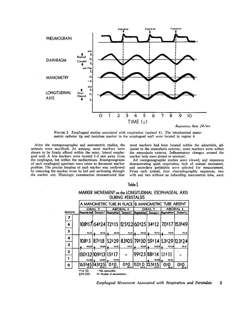 The outer, lateral esophageal walls in the distal half of the esophagus in each of five cats were labeled with small tantalum wires. About 8 wk later, esophageal motion associated with respiration and peristalsis, induced by injecting barium boli (5 ml each) into the proximal esophagus, was recorded on cine and serial biplane roentgenograms while recording intraluminal esophageal pressures simultaneously by manometry. Esophageal motion was also evaluated without a manometric tube in place. The coordinates for each marker were digitized and a computer was used to plot marker position against time. During respiration, the markers passively made a shallow, 2-10 mm excursion on the longitudinal esophageal axis. This movement was synchronous with thoracic and diaphragmatic movement and changes in intraluminal esophageal pressure. Immediately after the onset of peristalsis, the markers made a pronounced oral movement of 10 mm or more above their mean respiratory position, as if to engulf the bolus. Markers in opposing esophageal walls approximated one another and commenced an aboral movement as the bolus tail, which was essentially co-incident with onset of the manometric pressure complex, passed the marker sites. The markers returned to their respective rest positions essentially coincident with passage of the pressure complex peak and then moved below their respective rest positions. The aboral excursion occurred predominantly after the bolus had emptied into the stomach. The magnitude and duration of oral excursion was significantly greater for the distal than for the more proximal markers; conversely, the magnitude and duration of aboral excursion was greater for the proximal than for the more distal markers. During the peristaltic sequence, the labeled portion of the esophagus shortened from 26 to 46% of its resting length. No evidence of esophageal torque was shown. These findings suggest that both the longitudinal and circular esophageal musculature play an active and important role during peristaltic transport of a bolus through the esophagus.