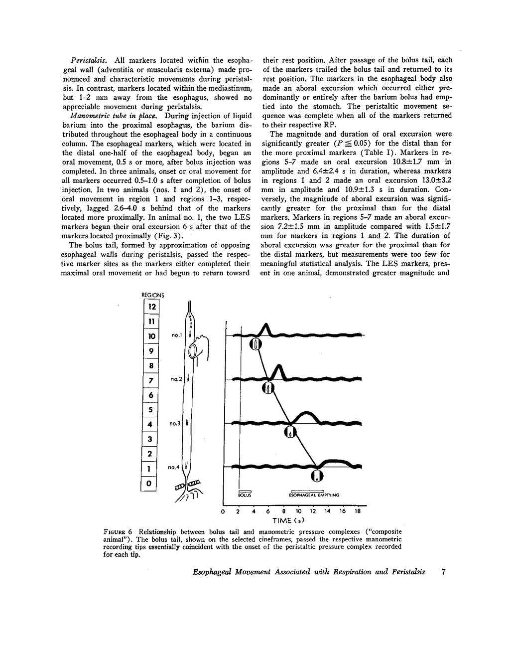 The outer, lateral esophageal walls in the distal half of the esophagus in each of five cats were labeled with small tantalum wires. About 8 wk later, esophageal motion associated with respiration and peristalsis, induced by injecting barium boli (5 ml each) into the proximal esophagus, was recorded on cine and serial biplane roentgenograms while recording intraluminal esophageal pressures simultaneously by manometry. Esophageal motion was also evaluated without a manometric tube in place. The coordinates for each marker were digitized and a computer was used to plot marker position against time. During respiration, the markers passively made a shallow, 2-10 mm excursion on the longitudinal esophageal axis. This movement was synchronous with thoracic and diaphragmatic movement and changes in intraluminal esophageal pressure. Immediately after the onset of peristalsis, the markers made a pronounced oral movement of 10 mm or more above their mean respiratory position, as if to engulf the bolus. Markers in opposing esophageal walls approximated one another and commenced an aboral movement as the bolus tail, which was essentially co-incident with onset of the manometric pressure complex, passed the marker sites. The markers returned to their respective rest positions essentially coincident with passage of the pressure complex peak and then moved below their respective rest positions. The aboral excursion occurred predominantly after the bolus had emptied into the stomach. The magnitude and duration of oral excursion was significantly greater for the distal than for the more proximal markers; conversely, the magnitude and duration of aboral excursion was greater for the proximal than for the more distal markers. During the peristaltic sequence, the labeled portion of the esophagus shortened from 26 to 46% of its resting length. No evidence of esophageal torque was shown. These findings suggest that both the longitudinal and circular esophageal musculature play an active and important role during peristaltic transport of a bolus through the esophagus.