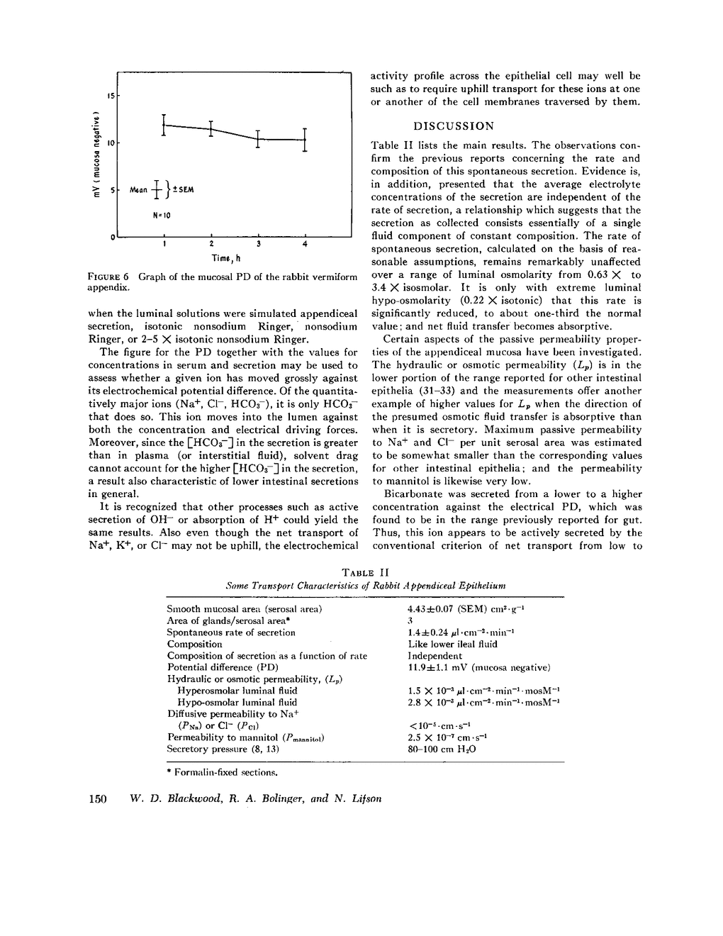 It has been confirmed that the rabbit vermiform appendix secretes spontaneously at a relatively rapid rate (1-12 ml·h-1; 1.4±0.24 μl·min-1·cm-2). The electrolyte composition is similar to that of ileal fluids and independent of the secretory rate. The transmural potential difference is about 12 mV, mucosa negative. Of the major electrolytes, only HCO3- is secreted grossly against its electrochemical potential difference. This finding plus the low hydraulic (or osmotic) permeability (Lp) and high secretory pressures of the organ strongly suggest that the secretion is an active one. The passive permeability to Na+ and Cl- appears to be, at most, somewhat less than for small bowel. Permeability to mannitol was estimated at 2.5 × 10-7 cm·s-1. On the basis of reasonable assumptions and results with luminal test solutions of differing osmolarities, it was concluded that (a) the Lp of the appendiceal epithelium is in the lower range of values reported for small bowel and colon; (b) the Lp is higher for osmotic absorption than for osmotic secretion; and (c) the rate of spontaneous secretion is insensitive to luminal anisotonicity over a wide range of values. But sufficiently hypotonic solutions can reverse net secretion to net absorption, more by inhibiting spontaneous secretion than increasing osmotic absorption. The rabbit vermiform appendix appears to be a useful model for the elucidation of intestinal secretory processes.
