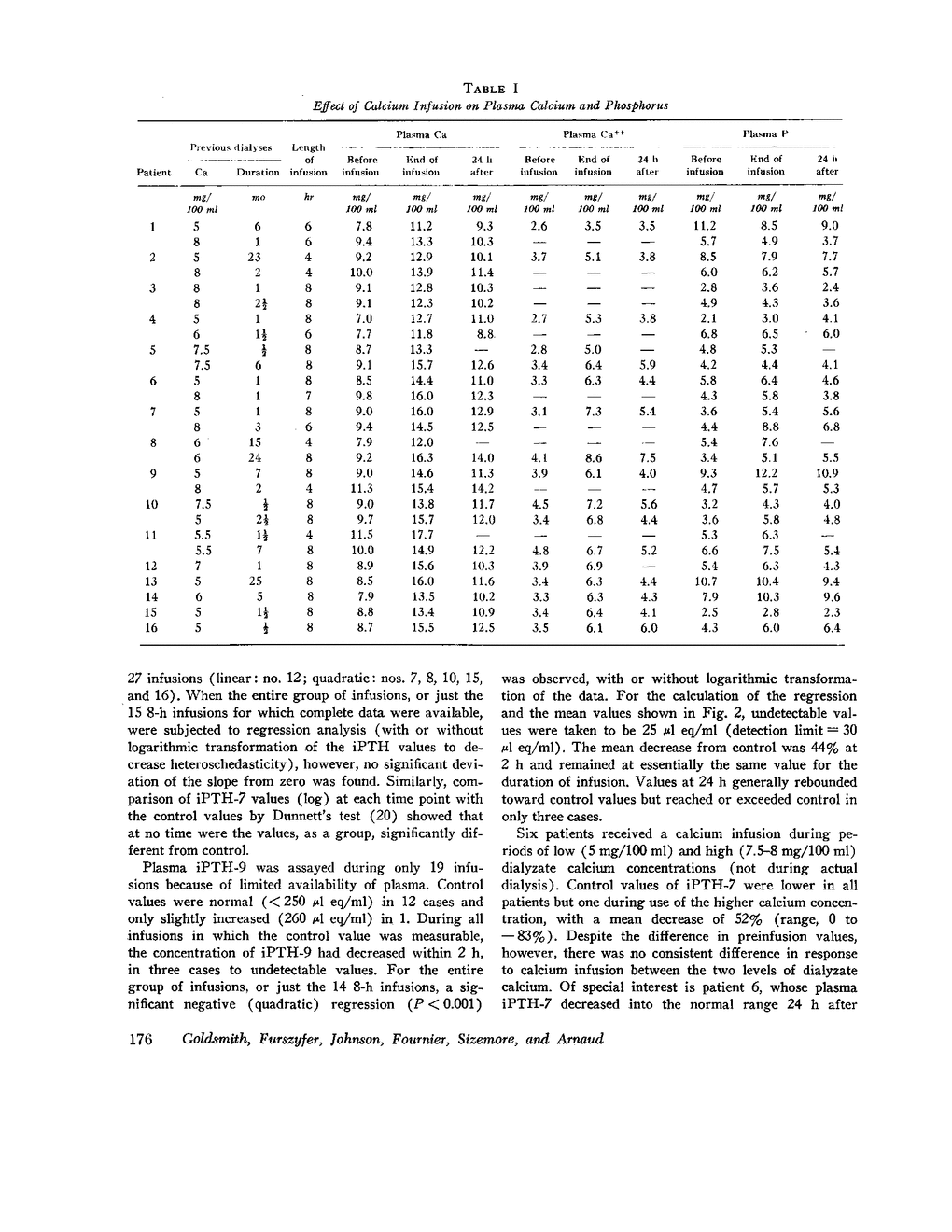 Parathyroid function was assessed by calcium infusions (4-8 h) in 16 patients with chronic renal insufficiency being treated by long-term hemodialysis. The concentrations of two immunoreactive species of parathyroid hormone in plasma (iPTH-9, mol wt 9500; iPTH-7, mol wt 7000) were estimated by radioimmunoassays utilizing two relatively specific antisera. Control values of the smaller species, iPTH-7, were uniformly high, whereas values of iPTH-9 were normal in 12 of 19 studies. Response of iPTH-7 to calcium infusions was variable, with significant decreases occurring only five times in 27 infusions. Concentrations of iPTH-9, however, decreased during every calcium infusion. In contrast to these acute responses, five of six patients studied during periods of dialysis against both low (< 6 mg/100 ml) and high (7-8 mg/100 ml) calcium concentrations in the dialyzate showed a decrease in values of iPTH-7 during the period of dialysis against the higher calcium concentration. It is concluded that plasma concentrations of iPTH-9 reflect primarily the moment-to-moment secretory status of the parathyroid glands, while concentrations of iPTH-7 reflect more closely chronic parathyroid functional status. It is further concluded that the failure of iPTH-7 to decrease during induced hypercalcemia should not be equated with autonomy of parathyroid gland function.