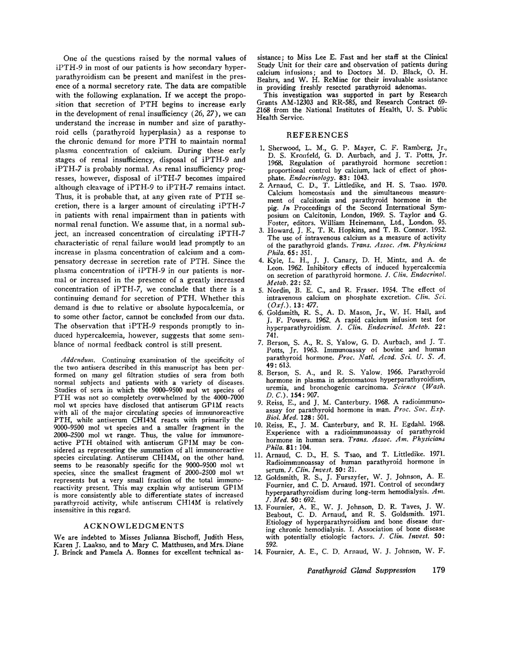 Parathyroid function was assessed by calcium infusions (4-8 h) in 16 patients with chronic renal insufficiency being treated by long-term hemodialysis. The concentrations of two immunoreactive species of parathyroid hormone in plasma (iPTH-9, mol wt 9500; iPTH-7, mol wt 7000) were estimated by radioimmunoassays utilizing two relatively specific antisera. Control values of the smaller species, iPTH-7, were uniformly high, whereas values of iPTH-9 were normal in 12 of 19 studies. Response of iPTH-7 to calcium infusions was variable, with significant decreases occurring only five times in 27 infusions. Concentrations of iPTH-9, however, decreased during every calcium infusion. In contrast to these acute responses, five of six patients studied during periods of dialysis against both low (< 6 mg/100 ml) and high (7-8 mg/100 ml) calcium concentrations in the dialyzate showed a decrease in values of iPTH-7 during the period of dialysis against the higher calcium concentration. It is concluded that plasma concentrations of iPTH-9 reflect primarily the moment-to-moment secretory status of the parathyroid glands, while concentrations of iPTH-7 reflect more closely chronic parathyroid functional status. It is further concluded that the failure of iPTH-7 to decrease during induced hypercalcemia should not be equated with autonomy of parathyroid gland function.