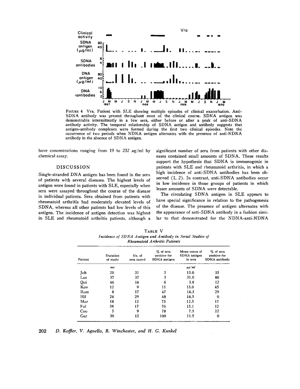 Single-stranded DNA (SDNA) occurs in high incidence and in greatest concentration in the sera of patients with systemic lupus erythematosus (SLE), where levels as high as 250 μg/ml were observed. SDNA appears to be an imunogen for anti-SDNA antibodies and forms complexes in vivo of both anti-SDNA-SDNA and anti-NDNA-SDNA types, which apparently play a role in the pathogenesis of the glomerulonephritis found in patients with SLE, SDNA is also found in high incidence but at lower levels in the sera of patients with rheumatoid arthritis. Lesser amounts of SDNA are found in several other diseases in which a low incidence of anti-SDNA antibodies is observed.