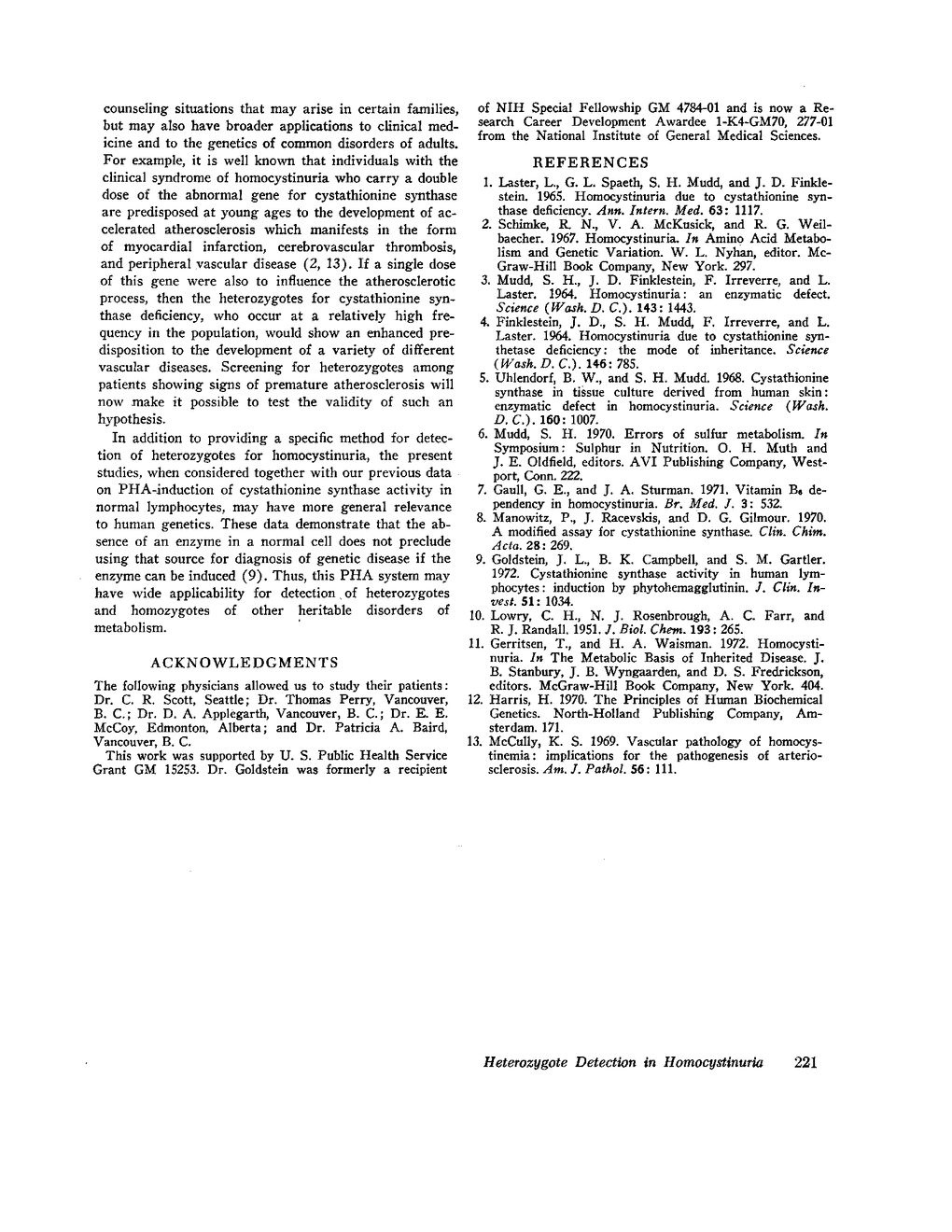 Deficiency of cystathionine synthase activity results in the clinical syndrome of homocystinuria. Using phytohemagglutinin (PHA)-stimulated lymphocytes as a readily available source of this enzyme, its activity has been compared in 48 control subjects, seven homozygotes affected with homocystinuria, and 17 obligate heterozygotes. PHA-induced enzyme levels were highest in controls (mean ±SEM, 666.9±70.2 pmol cystathionine formed/mg protein per 4 h), intermediate in heterozygotes (114.4±27.3), and absent to severely deficient in homozygotes (2.0±1.6). Since only three of the 17 values from the obligate heterozygotes overlapped into the control range, this simple method may become clinically useful for heterozygote detection of carriers of the gene for abnormal cystathionine synthase. In addition, this system for induction of cystathionine synthase in lymphocytes has a more general relevance to human biochemical genetics in that it demonstrates that the absence of an enzyme in a normal cell does not preclude using that source for diagnosis of genetic disease if the enzyme can be induced.