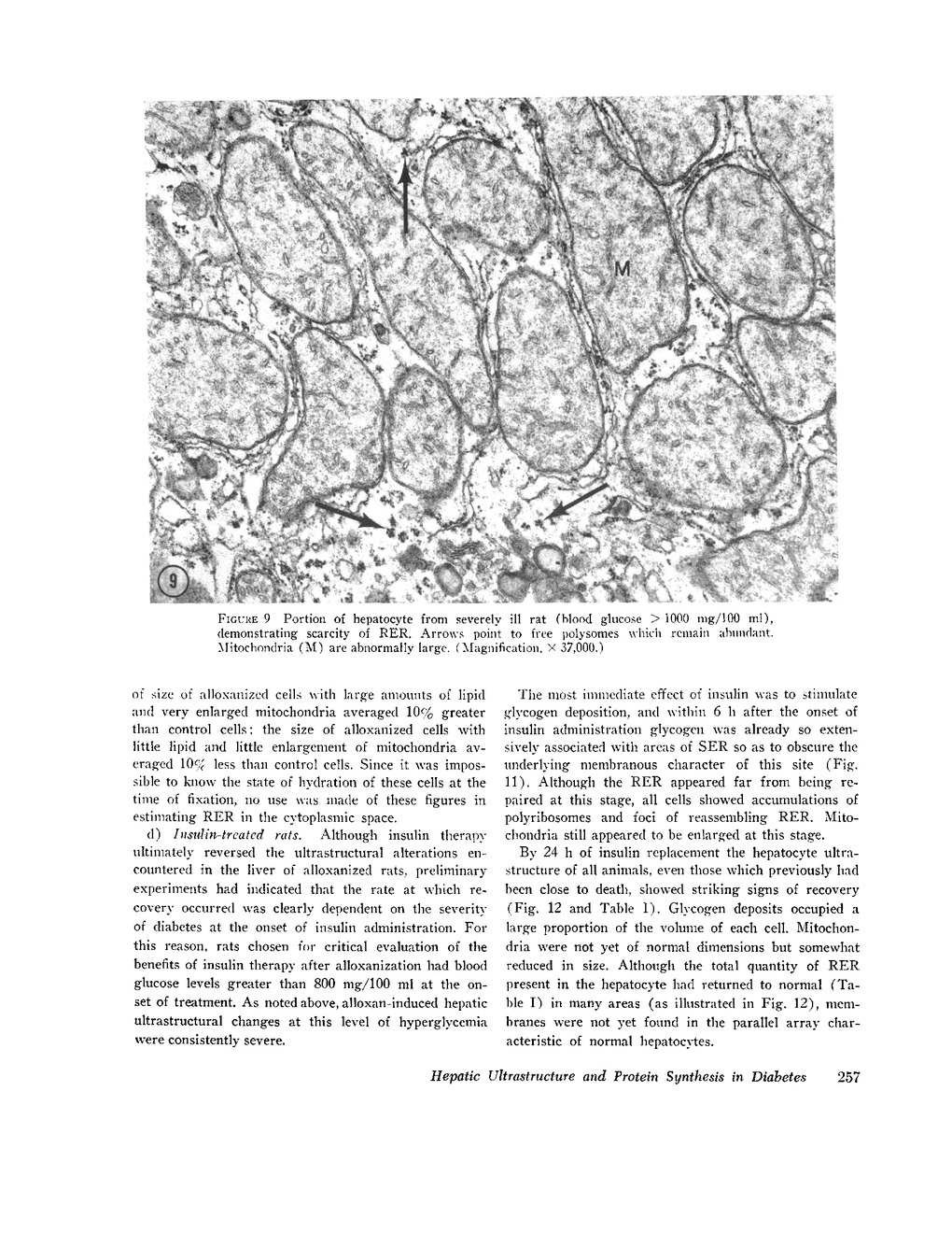 The following study was conducted in order to define the specific alterations in hepatic ultrastructure responsible for the decrease in hepatic protein synthesis associated with experimental diabetes. Rats received intravenous alloxan (70 mg/kg) and 48 h later were either sacrificed or given insulin for 1, 2, 4, 6, or 24 h. Specimens for electron microscopic evaluation and morphometric analysis were taken from the same livers used to isolate ribosomes for measurement of in vitro protein synthesis. Our results show that hepatocytes from animals with untreated alloxan diabetes show varying degrees of disorganization and loss of rough endoplasmic reticulum (RER) which is directly related to the severity of the alloxan diabetes. A significant correlation existed between the severity of ultrastructural changes as judged by the loss of both membrane and polysome components of the RER and degree of inhibition of protein synthesis (P < 0.001). Abnormalities of hepatic ultrastructure and protein synthesis were reversed within 24 h of insulin administration. The data are consistent with the view that it is the relative decrease in hepatic polysomes that results from the loss of RER in alloxan diabetes that is responsible for the decrease in hepatic protein synthesis.