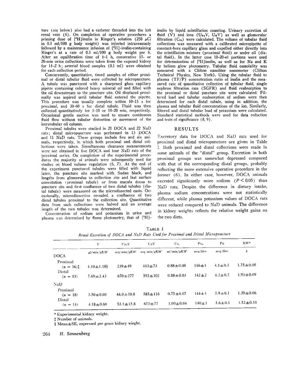 Proximal and distal tubular function was compared with urinary excretion in rats after chronic administration of salt and deoxycorticosterone acetate (DOCA) or during salt deprivation. DOCA rats excreted significantly more sodium than did salt-deprived rats. Measurements of tubular fluid to plasma (TF/P) inulin ratios and concentrations of sodium and potassium in quantitative, timed collections, related to measured tubular length, allowed calculation of absolute reabsorption of fluid and ions in the different nephron segments. Proximal transport was not reduced in DOCA-treated rats compared with salt-deprived animals; in distal tubule the former group reabsorbed more sodium and secreted less potassium than the latter. Calculation of sodium transport in loop of Henle as the difference in flow between the end of the proximal convolution and the beginnings of the distal tubule indicated no inhibition of reabsorption in DOCA animals. Comparison of end-distal tubular flow with simultaneous urinary excretion suggested that sodium load was not the determining factor of enhanced natriuresis in DOCA-treated animals. The data are interpreted as indicating that DOCA-escape in the rat is associated with specific alteration of sodium transport in the collecting duct system.