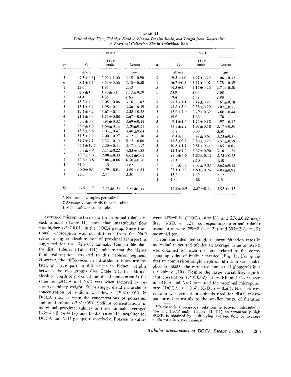 Proximal and distal tubular function was compared with urinary excretion in rats after chronic administration of salt and deoxycorticosterone acetate (DOCA) or during salt deprivation. DOCA rats excreted significantly more sodium than did salt-deprived rats. Measurements of tubular fluid to plasma (TF/P) inulin ratios and concentrations of sodium and potassium in quantitative, timed collections, related to measured tubular length, allowed calculation of absolute reabsorption of fluid and ions in the different nephron segments. Proximal transport was not reduced in DOCA-treated rats compared with salt-deprived animals; in distal tubule the former group reabsorbed more sodium and secreted less potassium than the latter. Calculation of sodium transport in loop of Henle as the difference in flow between the end of the proximal convolution and the beginnings of the distal tubule indicated no inhibition of reabsorption in DOCA animals. Comparison of end-distal tubular flow with simultaneous urinary excretion suggested that sodium load was not the determining factor of enhanced natriuresis in DOCA-treated animals. The data are interpreted as indicating that DOCA-escape in the rat is associated with specific alteration of sodium transport in the collecting duct system.