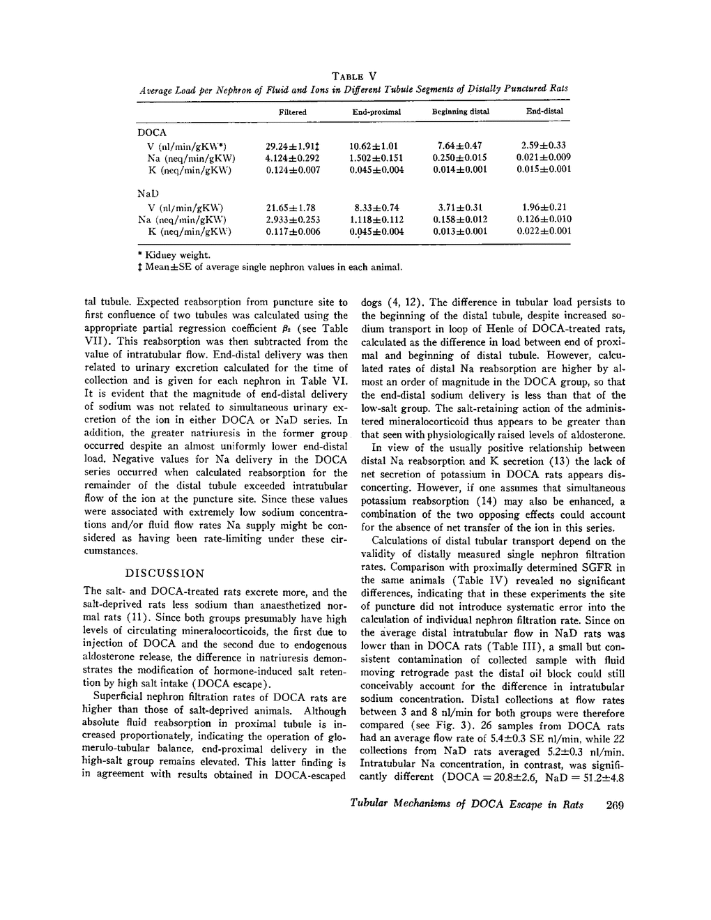 Proximal and distal tubular function was compared with urinary excretion in rats after chronic administration of salt and deoxycorticosterone acetate (DOCA) or during salt deprivation. DOCA rats excreted significantly more sodium than did salt-deprived rats. Measurements of tubular fluid to plasma (TF/P) inulin ratios and concentrations of sodium and potassium in quantitative, timed collections, related to measured tubular length, allowed calculation of absolute reabsorption of fluid and ions in the different nephron segments. Proximal transport was not reduced in DOCA-treated rats compared with salt-deprived animals; in distal tubule the former group reabsorbed more sodium and secreted less potassium than the latter. Calculation of sodium transport in loop of Henle as the difference in flow between the end of the proximal convolution and the beginnings of the distal tubule indicated no inhibition of reabsorption in DOCA animals. Comparison of end-distal tubular flow with simultaneous urinary excretion suggested that sodium load was not the determining factor of enhanced natriuresis in DOCA-treated animals. The data are interpreted as indicating that DOCA-escape in the rat is associated with specific alteration of sodium transport in the collecting duct system.