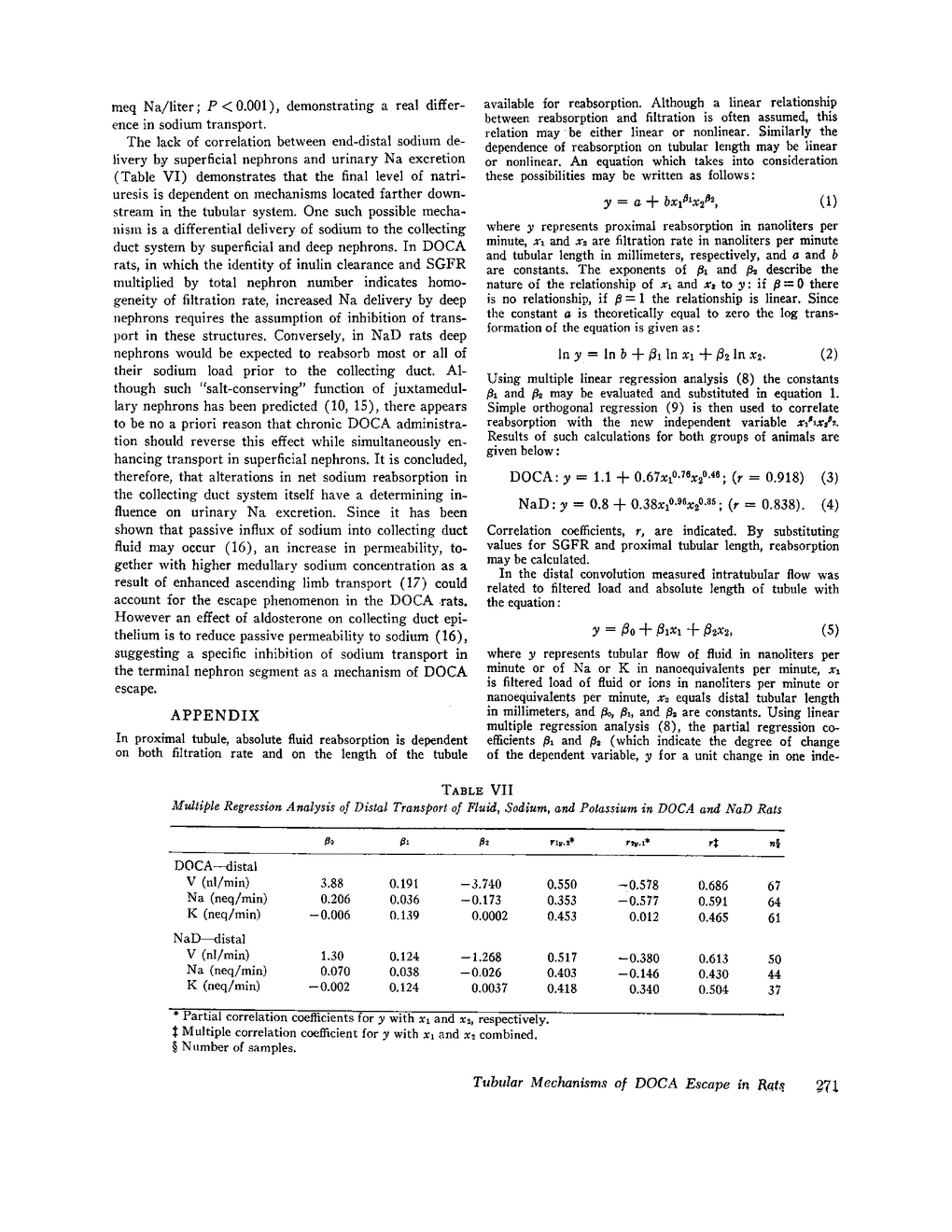 Proximal and distal tubular function was compared with urinary excretion in rats after chronic administration of salt and deoxycorticosterone acetate (DOCA) or during salt deprivation. DOCA rats excreted significantly more sodium than did salt-deprived rats. Measurements of tubular fluid to plasma (TF/P) inulin ratios and concentrations of sodium and potassium in quantitative, timed collections, related to measured tubular length, allowed calculation of absolute reabsorption of fluid and ions in the different nephron segments. Proximal transport was not reduced in DOCA-treated rats compared with salt-deprived animals; in distal tubule the former group reabsorbed more sodium and secreted less potassium than the latter. Calculation of sodium transport in loop of Henle as the difference in flow between the end of the proximal convolution and the beginnings of the distal tubule indicated no inhibition of reabsorption in DOCA animals. Comparison of end-distal tubular flow with simultaneous urinary excretion suggested that sodium load was not the determining factor of enhanced natriuresis in DOCA-treated animals. The data are interpreted as indicating that DOCA-escape in the rat is associated with specific alteration of sodium transport in the collecting duct system.