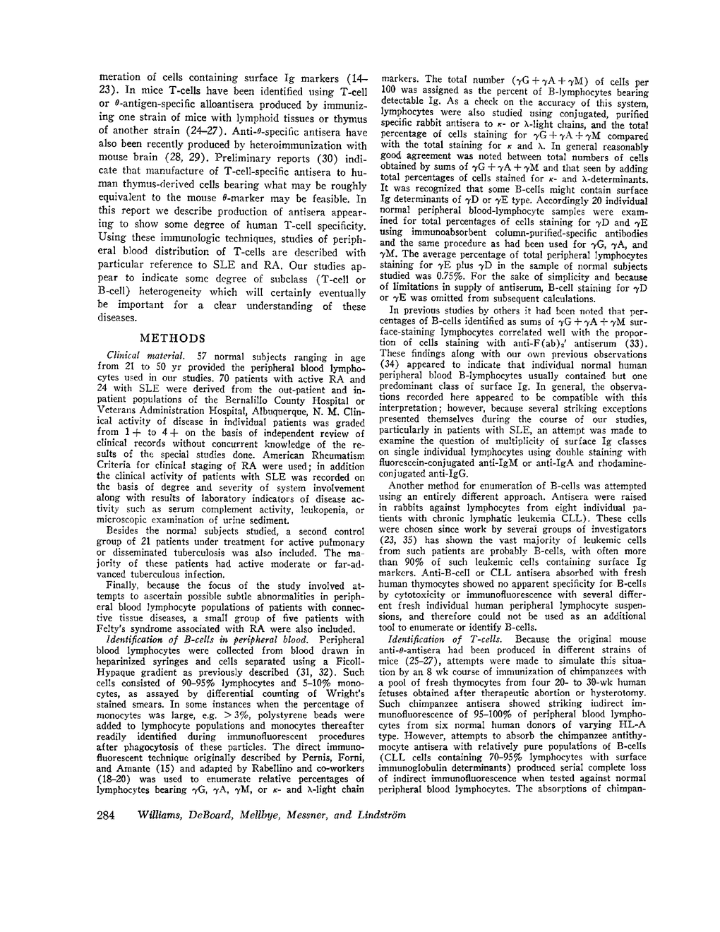 Peripheral blood lymphocytes from normal subjects as well as patients with rheumatoid arthritis (RA), systemic lupus erythematosus (SLE), and active tuberculosis were studied for the relative distribution of bone marrow-derived lymphocytes (B-cells) and thymic-derived T-cells. B-cells were identified by direct immunofluorescence of surface Ig markers; T-cells were studied using rabbit antisera to pooled human fetal thymocytes absorbed with chronic lymphatic leukemia lymphocytes as a source of B-cells. In normal subjects, the sum of percentages of peripheral blood lymphocytes staining for surface Ig (B-cells) plus the percentage of cells staining with the absorbed antithymocyte antiserum closely approximated 100%. The mean value for percent B-cells among 51 normals tested was 22.9%±7.1; mean T-cells value was 75.3±13.95%. T-cell-specific antiserum stained 18% of normal human bone marrow lymphocytes, 42.5% of lymphocytes from normal spleens, and 98% of cells obtained from thoracic duct drainage of patients with RA. Specificity of antihuman thymocyte antiserum appeared to depend on the use of living cells.