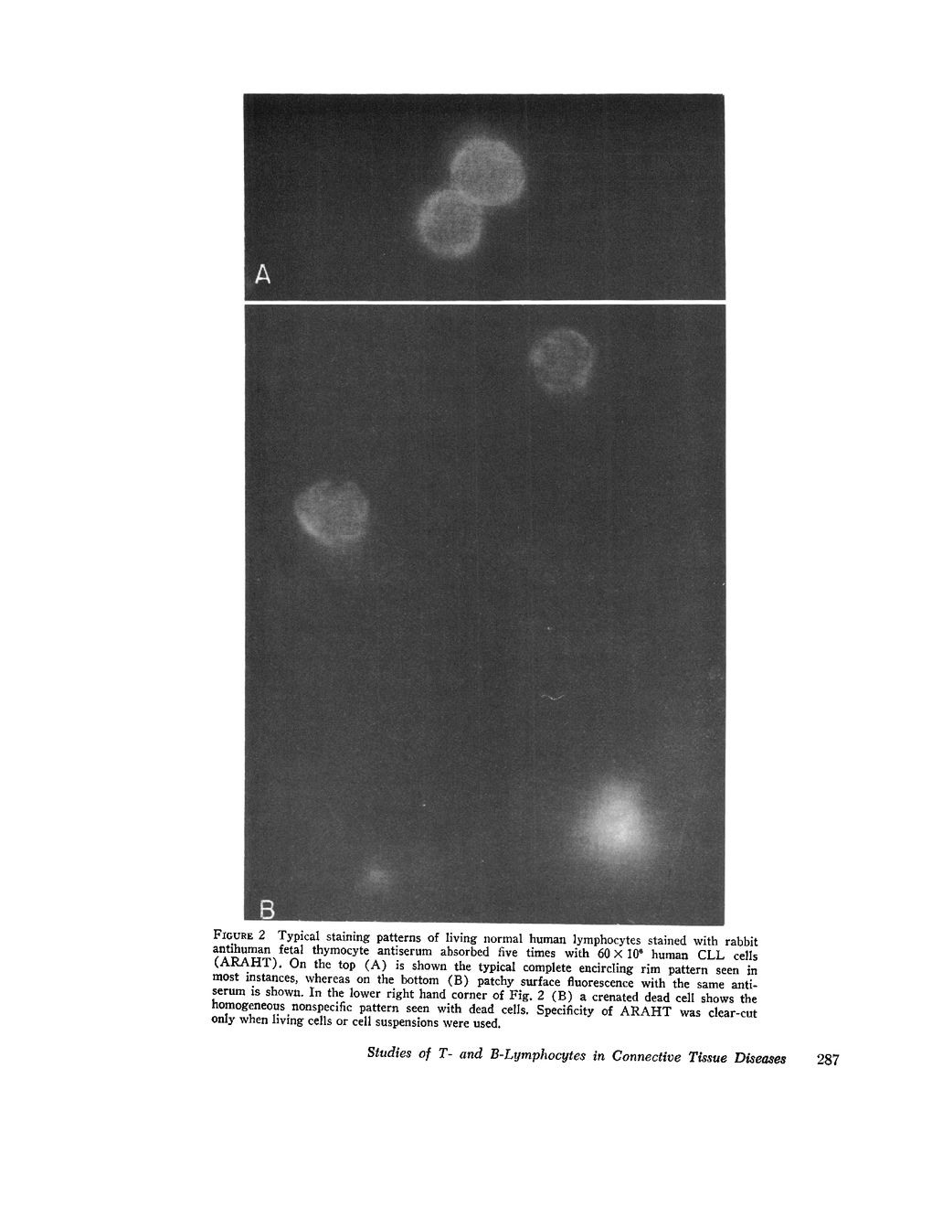 Peripheral blood lymphocytes from normal subjects as well as patients with rheumatoid arthritis (RA), systemic lupus erythematosus (SLE), and active tuberculosis were studied for the relative distribution of bone marrow-derived lymphocytes (B-cells) and thymic-derived T-cells. B-cells were identified by direct immunofluorescence of surface Ig markers; T-cells were studied using rabbit antisera to pooled human fetal thymocytes absorbed with chronic lymphatic leukemia lymphocytes as a source of B-cells. In normal subjects, the sum of percentages of peripheral blood lymphocytes staining for surface Ig (B-cells) plus the percentage of cells staining with the absorbed antithymocyte antiserum closely approximated 100%. The mean value for percent B-cells among 51 normals tested was 22.9%±7.1; mean T-cells value was 75.3±13.95%. T-cell-specific antiserum stained 18% of normal human bone marrow lymphocytes, 42.5% of lymphocytes from normal spleens, and 98% of cells obtained from thoracic duct drainage of patients with RA. Specificity of antihuman thymocyte antiserum appeared to depend on the use of living cells.