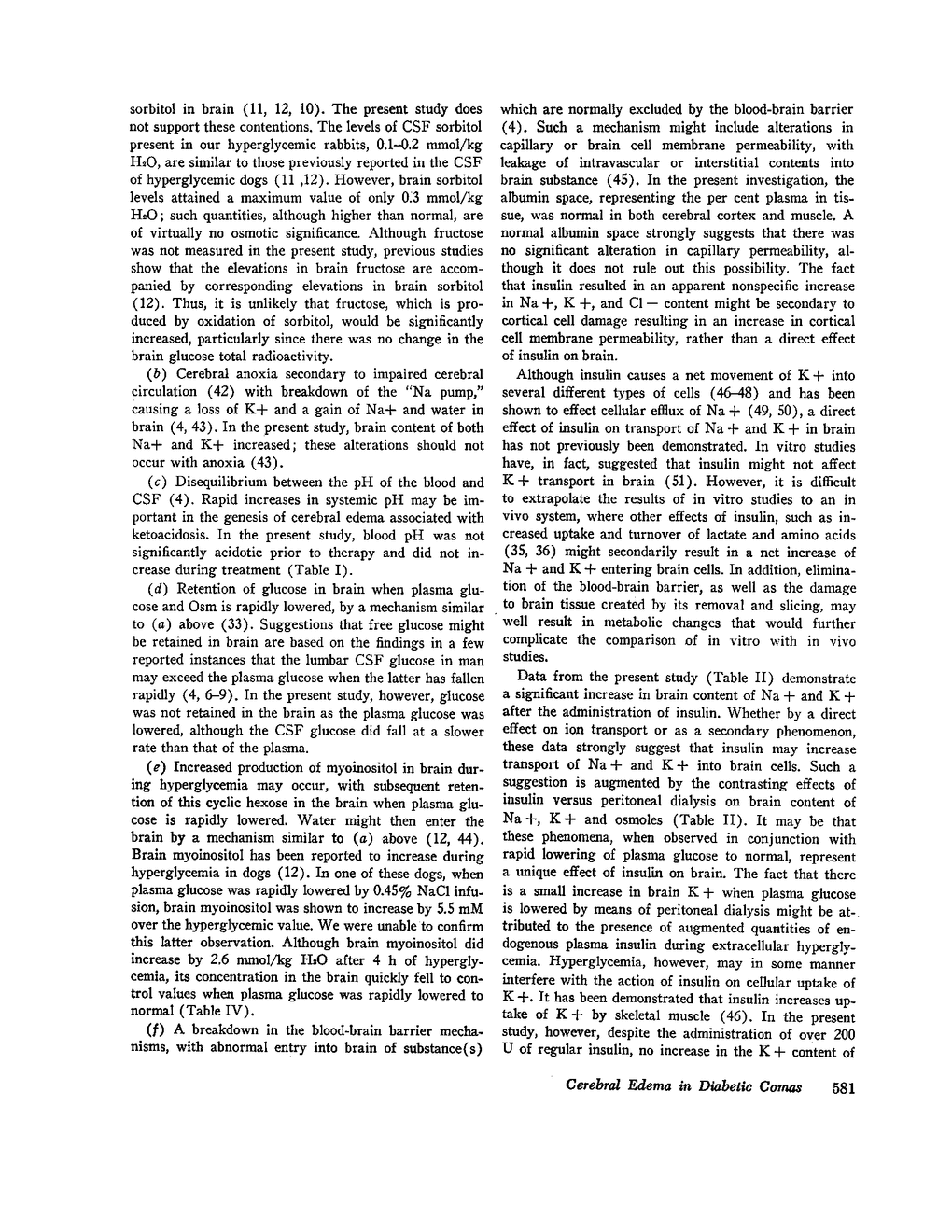 To investigate the pathophysiology of cerebral edema occurring during treatment of diabetic coma, the effects of hyperglycemia and rapid lowering of plasma glucose were evaluated in normal rabbits. During 2 h of hyperglycemia (plasma glucose=61 mM), both brain (cerebral cortex) and muscle initially lost about 10% of water content. After 4 h of hyperglycemia, skeletal muscle water content remained low but that of brain was normal. Brain osmolality (Osm) (343 mosmol/kg H2O) was similar to that of cerebrospinal fluid (CSF) (340 mosmol/kg), but increases in the concentration of Na+, K+, Cl-, glucose, sorbitol, lactate, urea, myoinositol, and amino acids accounted for only about half of this increase. The unidentified solute was designated “idiogenic osmoles”. When plasma glucose was rapidly lowered to normal with insulin, there was gross brain edema, increases in brain content of water, Na+, K+, Cl- and idiogenic osmoles, and a significant osmotic gradient from brain (326 mosmol/kg H2O) to plasma (287 mosmol/kg). By similarly lowering plasma glucose with peritoneal dialysis, increases in brain Na+, K+, Cl-, and water were significantly less, idiogenic osmoles were not present, and brain and plasma Osm were not different. It is concluded that during sustained hyperglycemia, the cerebral cortex adapts to extracellular hyperosmolality primarily by accumulation of idiogenic osmoles rather than loss of water or gain in solute. When plasma glucose is rapidly lowered with insulin, an osmotic gradient develops from brain to plasma. Despite the brain to plasma osmotic gradient, there is no net movement of water into brain until plasma glucose has fallen to at least 14 mM, at which time cerebral edema occurs.