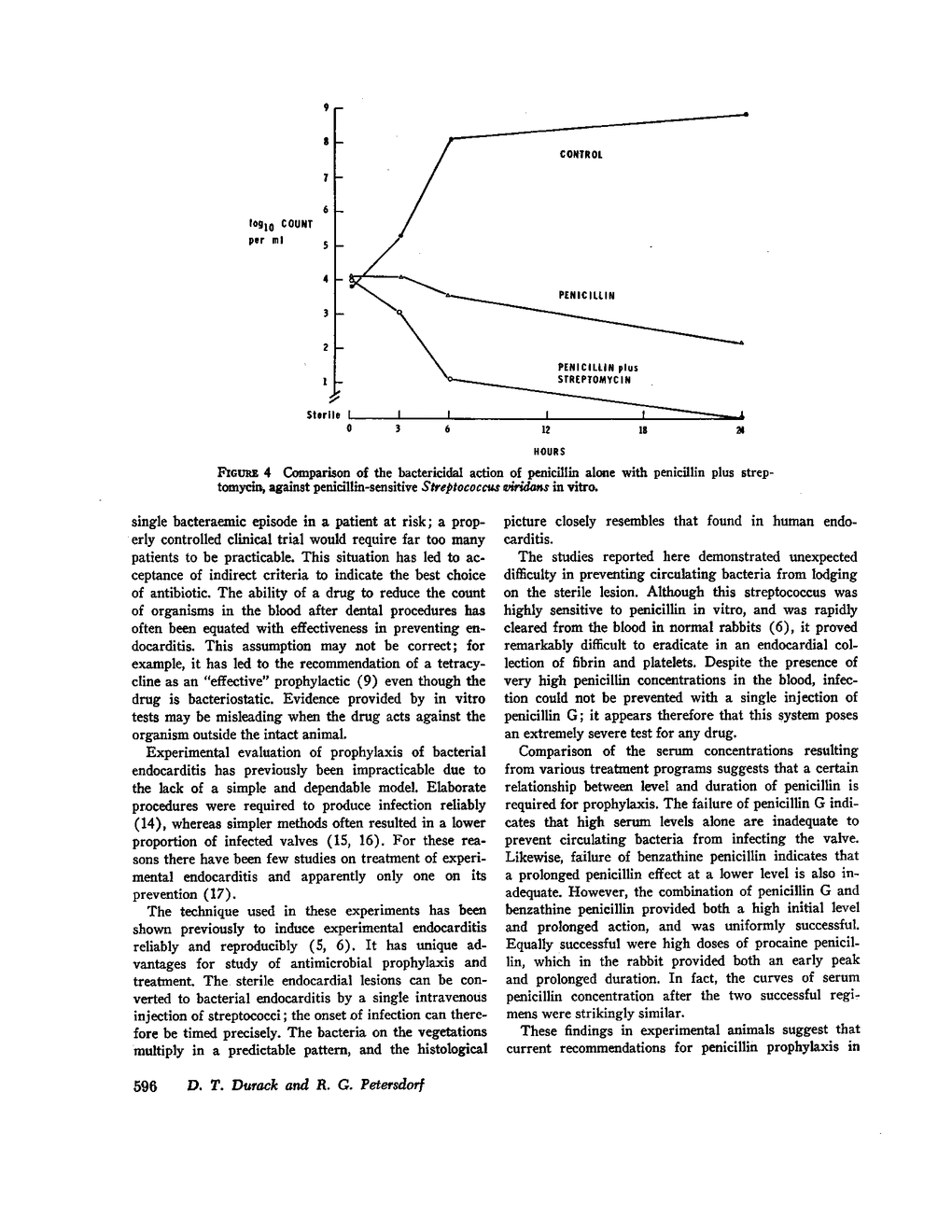 The effectiveness of various antibiotics commonly recommended for the prophylaxis of bacterial endocarditis has been evaluated in experimental streptococcal endocarditis in rabbits. High doses of penicillin G did not prevent the development of this infection. The only consistently successful prophylactic regimens using penicillin alone were those which provided for both an early high serum level and more than 9 h of effective antimicrobial action. Vancomycin was the only other drug which proved uniformly successful when given alone, even though the duration of its antimicrobial action in the blood was only 3 h. However, combined therapy using penicillin G or ampicillin with streptomycin was always effective in prophylaxis. Treatment with single injections of ampicillin, cephaloridine, cephalexin, clindamycin, cotrimoxazole, rifampicin, streptomycin, erythromycin, and tetracycline failed to prevent infection.