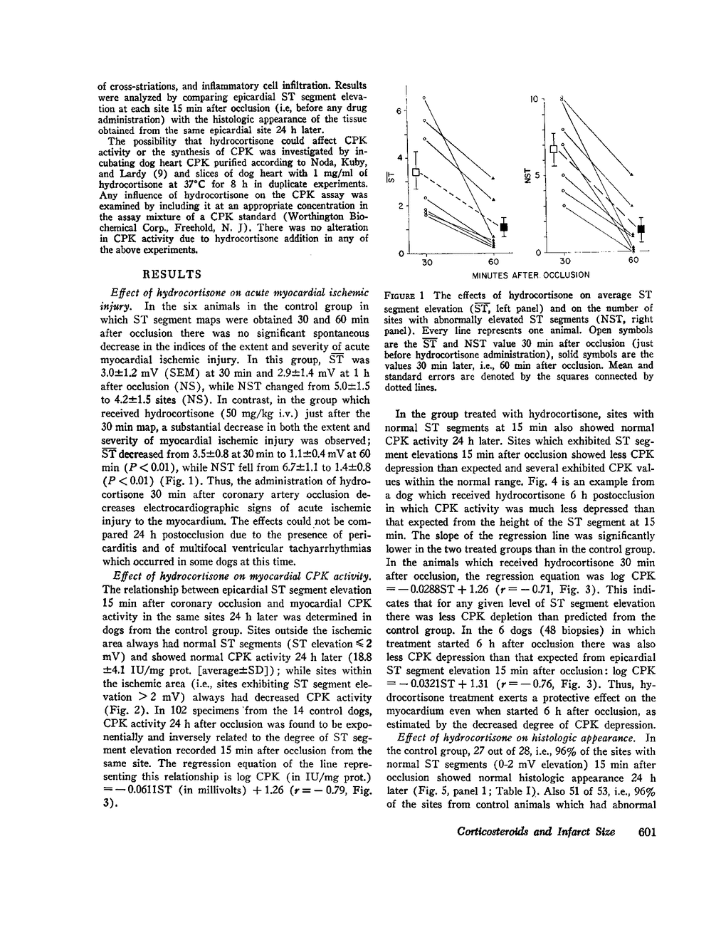 The influence of the administration of pharmacologic doses of hydrocortisone on the extent and severity of acute myocardial ischemic injury and on subsequent necrosis after acute coronary occlusion was investigated in 28 dogs. In order to study acute myocardial injury, repeated epicardial electrocardiograms were recorded from 10 to 15 sites on the anterior surface of the left ventricle. Average ST segment elevation (S̄T̄) and the number of sites in which ST segment elevation exceeded 2 mV (NST), indices of the magnitude and extent of myocardial injury, respectively, were analyzed at 30 and 60 min after coronary occlusion. In the control group S̄T̄ and NST did not change significantly in this time interval while in the treated group, which received 50 mg/kg hydrocortisone just after the 30 min recording, S̄T̄ fell from 3.5±0.8 to 1.1±0.4 mV (P<0.01) and NST was reduced from 6.7±1.1 to 1.4±0.8 (P<0.01). In order to study the influence of hydrocortisone on necrosis, epicardial ST segment elevation 15 min after coronary occlusion was compared to myocardial creatine phosphokinase activity (CPK) and histologic appearance 24 h later in each site. In a control group (14 dogs) a relationship was established between ST segment elevation at 15 min (in millivolts) and CPK activity (in international units per milligram of protein) 24 h later: log CPK = -0.0611ST + 1.26 (N = 102 specimens, r = -0.79). In the treated groups, hydrocortisone (50 mg/kg i.v.) was given either at 30 min after occlusion (seven dogs) or at 6 h after occlusion (six dogs). Both groups received supplementary doses of hydrocortisone (25 mg/kg) 12 h after occlusion. The two treated groups exhibited less CPK depression than that expected from ST segment elevation at each site, with slopes of the regression lines which were significantly less steep: log CPK = -0.0288ST + 1.26 (N = 48, r = -0.71) and log CPK = -0.0321ST + 1.31 (N = 48, r = -0.76) in the ½ h and 6 h groups, respectively. Histologically, sites with ST segment elevations of less than 2 mV at 15 min after occlusion exhibited normal appearance 24 h later. Sites with ST segment elevations (> 2 mV) in the control group showed histologic changes compatible with early myocardial infarction in 96% of specimens, while this occurred only in 61% and 63% of specimens, respectively, in the treated groups, showing that over one third of the sites were protected from undergoing necrosis due to the intervening hydrocortisone treatment. Thus pharmacological doses of hydrocortisone prevent myocardial cells from progressing to ischemic necrosis even when administration is initiated 6 h after coronary occlusion.