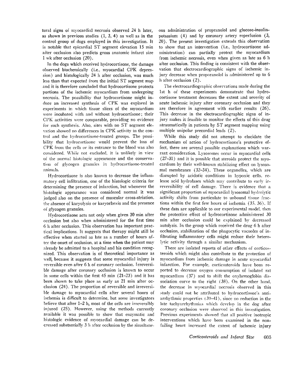 The influence of the administration of pharmacologic doses of hydrocortisone on the extent and severity of acute myocardial ischemic injury and on subsequent necrosis after acute coronary occlusion was investigated in 28 dogs. In order to study acute myocardial injury, repeated epicardial electrocardiograms were recorded from 10 to 15 sites on the anterior surface of the left ventricle. Average ST segment elevation (S̄T̄) and the number of sites in which ST segment elevation exceeded 2 mV (NST), indices of the magnitude and extent of myocardial injury, respectively, were analyzed at 30 and 60 min after coronary occlusion. In the control group S̄T̄ and NST did not change significantly in this time interval while in the treated group, which received 50 mg/kg hydrocortisone just after the 30 min recording, S̄T̄ fell from 3.5±0.8 to 1.1±0.4 mV (P<0.01) and NST was reduced from 6.7±1.1 to 1.4±0.8 (P<0.01). In order to study the influence of hydrocortisone on necrosis, epicardial ST segment elevation 15 min after coronary occlusion was compared to myocardial creatine phosphokinase activity (CPK) and histologic appearance 24 h later in each site. In a control group (14 dogs) a relationship was established between ST segment elevation at 15 min (in millivolts) and CPK activity (in international units per milligram of protein) 24 h later: log CPK = -0.0611ST + 1.26 (N = 102 specimens, r = -0.79). In the treated groups, hydrocortisone (50 mg/kg i.v.) was given either at 30 min after occlusion (seven dogs) or at 6 h after occlusion (six dogs). Both groups received supplementary doses of hydrocortisone (25 mg/kg) 12 h after occlusion. The two treated groups exhibited less CPK depression than that expected from ST segment elevation at each site, with slopes of the regression lines which were significantly less steep: log CPK = -0.0288ST + 1.26 (N = 48, r = -0.71) and log CPK = -0.0321ST + 1.31 (N = 48, r = -0.76) in the ½ h and 6 h groups, respectively. Histologically, sites with ST segment elevations of less than 2 mV at 15 min after occlusion exhibited normal appearance 24 h later. Sites with ST segment elevations (> 2 mV) in the control group showed histologic changes compatible with early myocardial infarction in 96% of specimens, while this occurred only in 61% and 63% of specimens, respectively, in the treated groups, showing that over one third of the sites were protected from undergoing necrosis due to the intervening hydrocortisone treatment. Thus pharmacological doses of hydrocortisone prevent myocardial cells from progressing to ischemic necrosis even when administration is initiated 6 h after coronary occlusion.