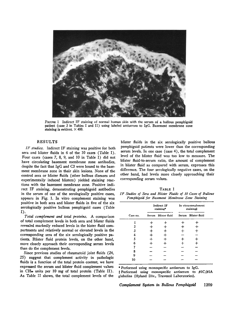 Compared with other serum and blister fluid proteins, total hemolytic complement was reduced in the blister fluid of six serologically positive bullous pemphigold patients while four serologically negative cases had blister fluid complement levels closely approaching the serum levels. Except for pemphigus vulgaris blisters. blister fluids from most patients with other bullous diseases and experimentally induced blisters had blister fluid complement levels more closely approaching the serum levels. With the exception of the two terminal components. C8 and C9, individual components of the complement sequence were also reduced in the blister fluids of the six bullous pemphigold patients with circulating basement membrane zone antibodies. On the other hand, transferrin and IgG levels of these same six serologically positive blister fluids closely approached the corresponding serum levels. Conversion of C3 proactivator was also demonstrable in the serologically positive bullous pemphigoid blister fluids, but not in the corresponding sera. Our studies, therefore, are suggestive of local activation of the complement sequence, by both the classical and alternate pathways, in blisters of serologically positive bullous pemphigold patients.